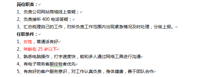 这是某电子商务公司招聘客服人员,我们可以看到在“任职条件”中,有非常明确的关于个人信息的要求,即“女性、年龄25岁以下”。当你在JD中看到这些信息的时候就要注意了,这些要求在你的简历中应该很明确的写出来。要求女性,则你需要写上性别,或是贴上照片;要求年龄,则需要表明出生年月,或是标明年龄。如果你不写上的话,很可能HR在筛选简历的时候就直接忽略了。