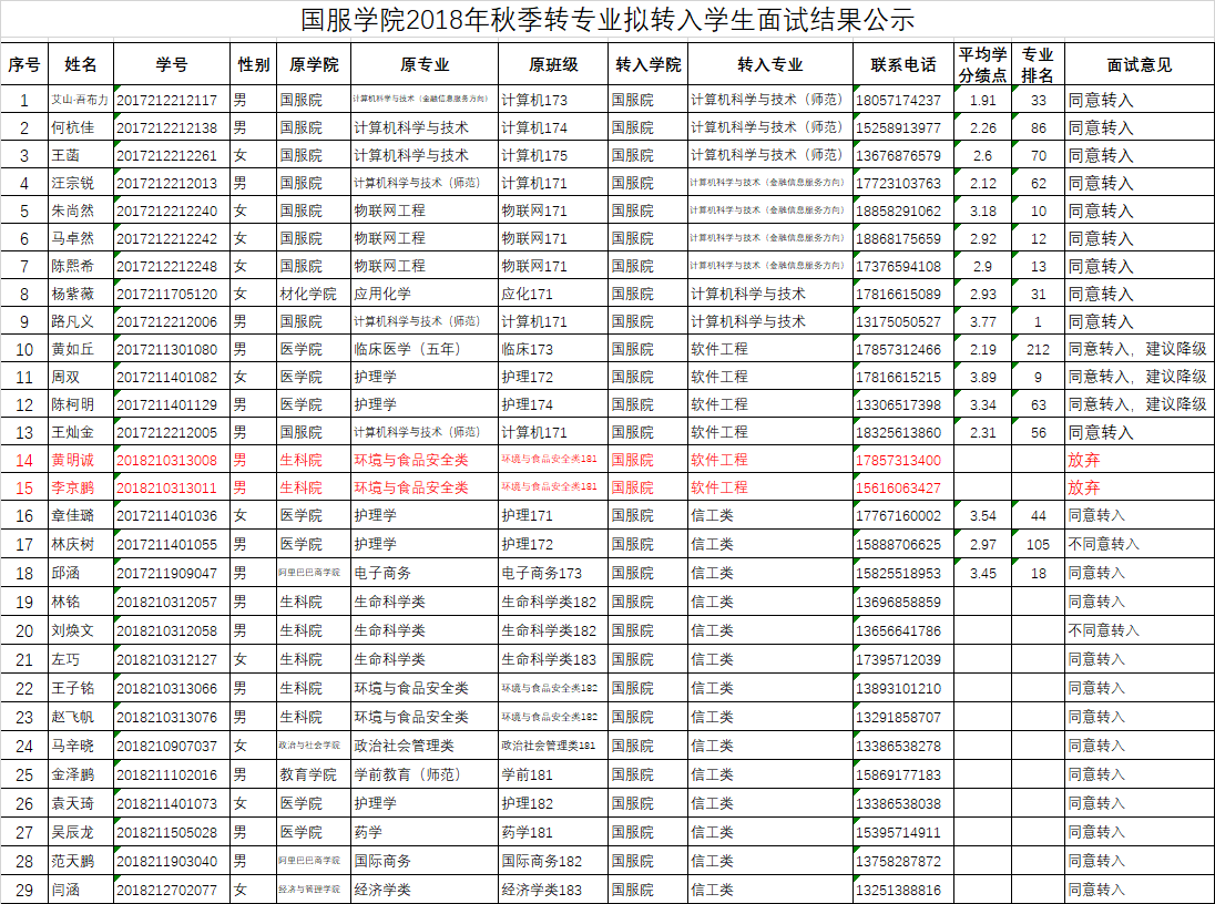 国服学院2018年秋季转专业拟转入学生面试结果公示