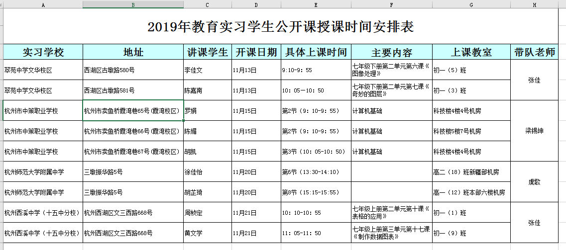 2016级师范生教育实习公开课即将开始,换妻 共有四个实习点,分别是:中策职高、杭师大附中、西溪中学、翠苑中学文华校区。各实习点公开课具体安排见下表: