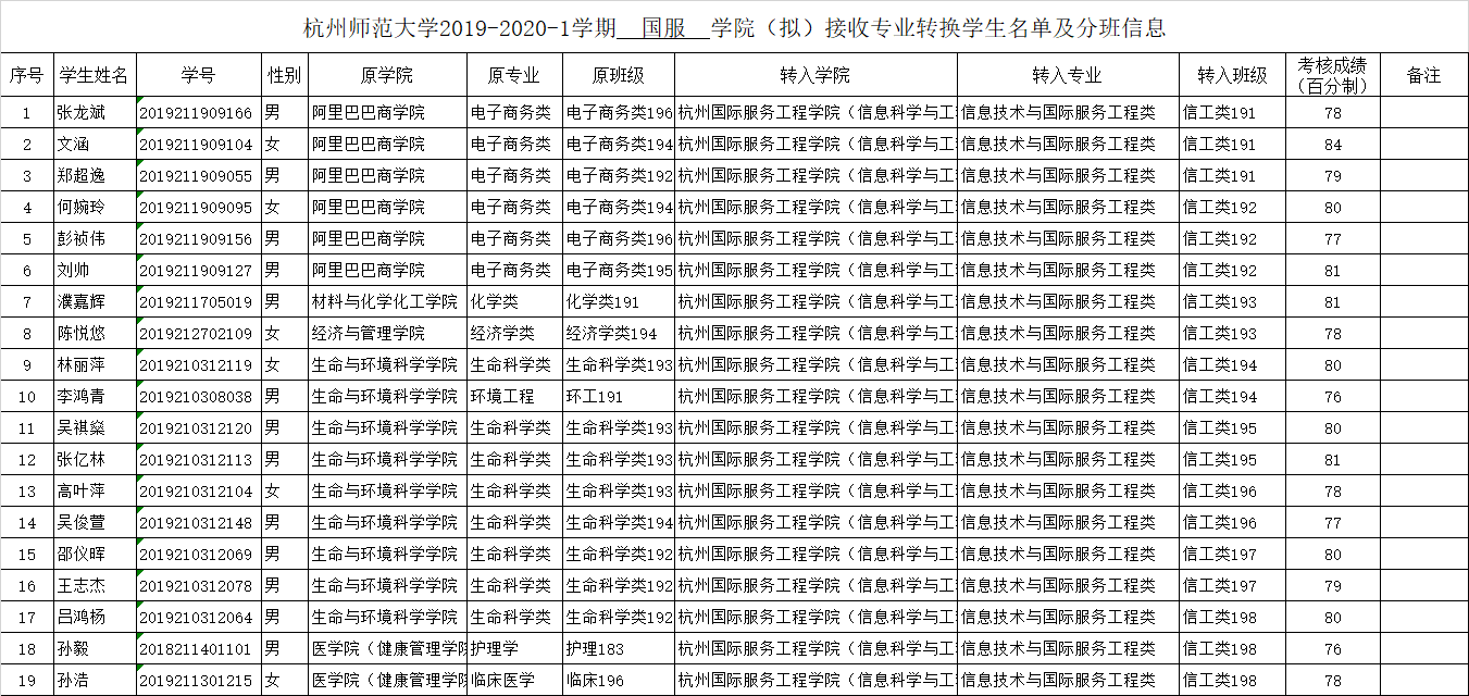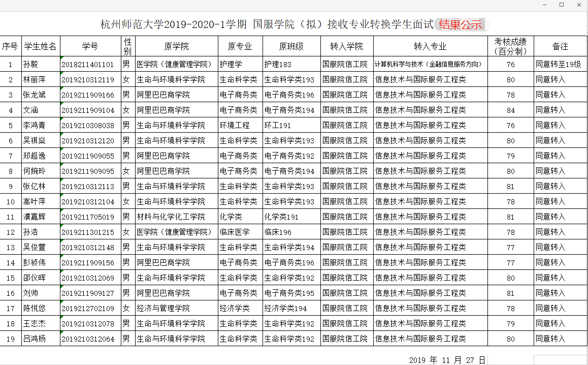2019-2020-2学期国服院(拟)接收专业转换学生面试结果公示(后附分班信息) 时间:2019-11-29 08:25:39 文章来源 :教学 浏览量:575 本学期专业转换拟接收学生面试结果现予公示,公示期三天,即日起至12月1日12:00止。有问题的可以请在公示期内联系学院教务科,公示期结束后将不受理任何咨询与投诉。联系电话:28869830,潘老师。