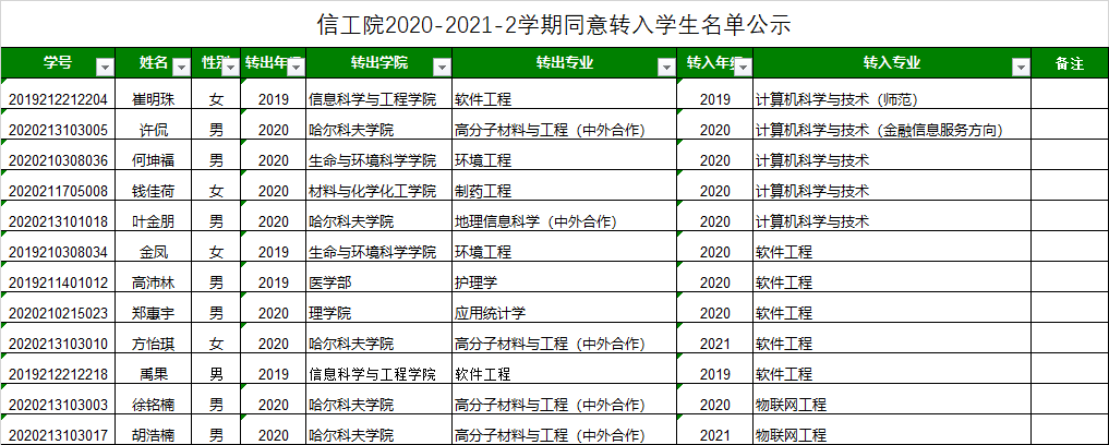 信息科学与工程学院2020-2021-2学期拟接收转专业学生公示 时间:2021-05-28 12:04:23 文章来源 :教学 浏览量:226 根据《换妻 本科生专业转换管理办法》(杭师大教〔2018〕11号)文件和《信工院2021年专业转换工作实施方案》的要求,经学院专业转换领导小组对申请转入学生进行面试考核,同意11名同学转入。现将同意转入学生名单予以公示,公示期即日始至6月2日中午12:00止。如有异议的请在公示期内联系学院教务科,28869830。