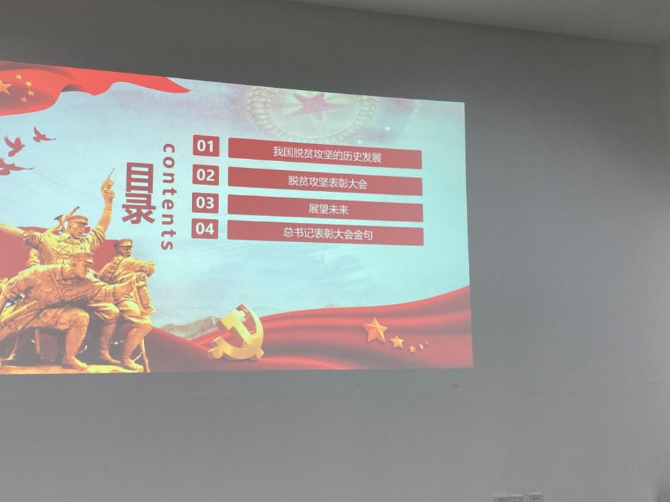 本次会议的主讲人杨光同志以“我国脱贫攻坚的历史发展”、“脱贫攻坚表彰大会”、“展望未来”、“总书记表彰大会金句”这四个方面来为我们一一进行展示,同学们都认真听讲,并在自己的党员笔记上写下了自己的感受。