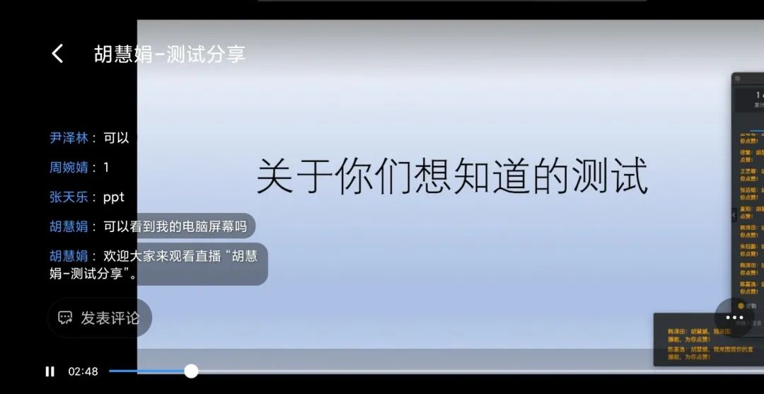 分享会伊始,由胡慧娟学姐进行主题为“关于你们想知道的测试”的分享。首先,胡慧娟学姐提出软件测试行业看重个人心态、编程能力及未来成长空间。随后,学姐指出软件测试工程师作为产品经理和研发工程师之间的沟通桥梁,需要更强的专业能力。最后,胡慧娟学姐提醒同学们,就职后也不要停滞学习的脚步,依旧要从代码能力、综合能力以及个人能力这三个方面不断提升自己。