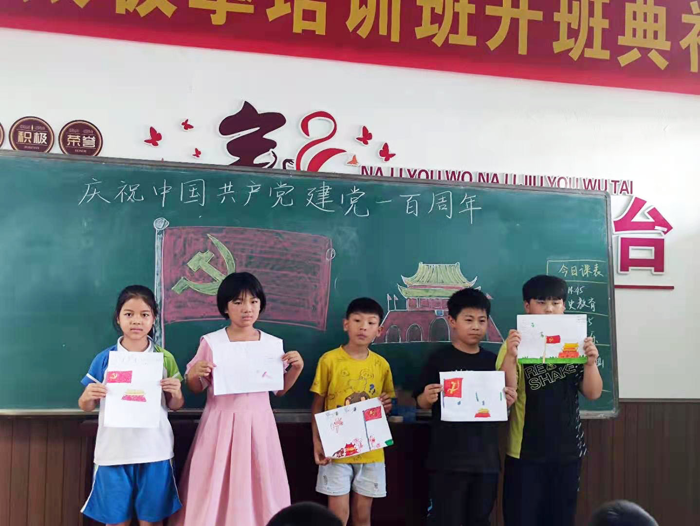 各支教队以献礼党的百年华诞为契机,结合青少年的学情,精心制作党史课程教育幻灯片。在河南省新蔡县赵塘小学,由于没有多媒体设备,支教队员通过手绘党旗和党徽,为孩子们讲述历史上那些可歌可泣的共产党员故事;在天台县明公村明岙小学,支教队员教孩子们合唱《歌唱祖国》,童声稚嫩,却一心向党,他们还带领孩子们参观当地的杨敬燮烈士墓,在革命烈士纪念碑前,支教队员带着孩子们缅怀革命先烈,学习前辈精神。同时还将党史中的杭师大先贤搬上讲台,在党史教育课上组织开展“党史中的杭师大人”等主题宣讲活动。在宁波市宁海县马岙小学,支教队员带领学生观看了关于校友陈望道先生的纪录片后,向他们讲述陈望道与《共产党宣言》的不解之缘。