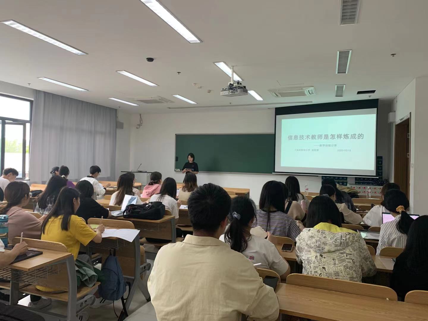 10月13日上午,太炎中学的黄玉燕老师带来了主题为“以终为始,以变应变”的分享。首先,她介绍了自己从应用心理学专业毕业生到成为综合实践与社政老师的个人经历,并结合自身教科室工作,从“什么时候规划、规划什么、怎么落实”三个角度,重点分析了师范生做职业规划的方方面面。随后,老师通过分享丰富的多学科教学经验,建议大家吃苦乐学、善思肯干,才能将计划落于实践。分享最后,黄老师推荐大家今后走上工作岗位后也要继续保持工作热情,兼顾日常积累和教研并进,始终以新人心态坚持不断学习。10月14日上午,星州小学的陈环环学姐进行主题为“信息老师那些事儿”的分享。首先,她介绍了小学信息技术教师的日常工作、小学各阶段的教材内容,以及可以带学生参加的各类科技竞赛,并推荐同学们可以着手准备起来,有自己的一技之长。随后,学姐罗列了教师应聘的几个硬性条件和展现个人魅力的方式,并结合自己的个人经历,分析了留杭和回家工作两个方向的优缺点,以及小初高三个学段各自的特点。最后,学姐也为大家总结了考编笔试的几种题型和范围,鼓励在座的同学们继续努力,发挥自己的特长,有目标地为一年后的教师招聘做准备。