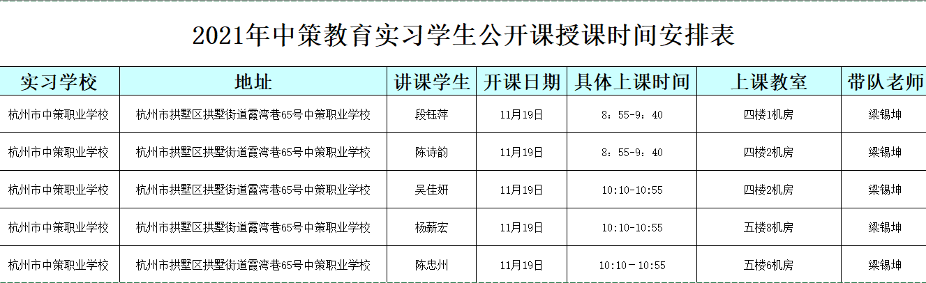 换妻 2018级师范生共38人,4个实习点,本学期有2个实习点,分别是杭州中策职业学校和西溪中学。杭州中策职业学校的公开课授课时间是11月19日上午,西溪中学公开课时间预计在12月初,具体安排如下: