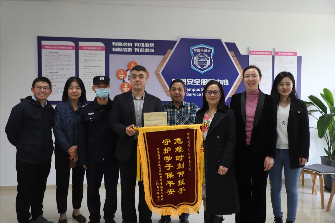 4月7日下午,学院党委书记周春儿、党委副书记余洁、办公室主任赵亚英、辅导员杨鹏飞、管雪到保卫处感谢保卫队员勇救学院一名遇险学生,由于学生目前已休学在家,家长特手写一封感谢信并诚挚委托学院领导和老师向学校保卫队员赠送锦旗表达谢意,赞扬保卫队员危急时刻挺身而出、认真负责的雷锋精神。校保卫处处长王飞、保卫队长郑珍田和校卫队员代表接受锦旗。