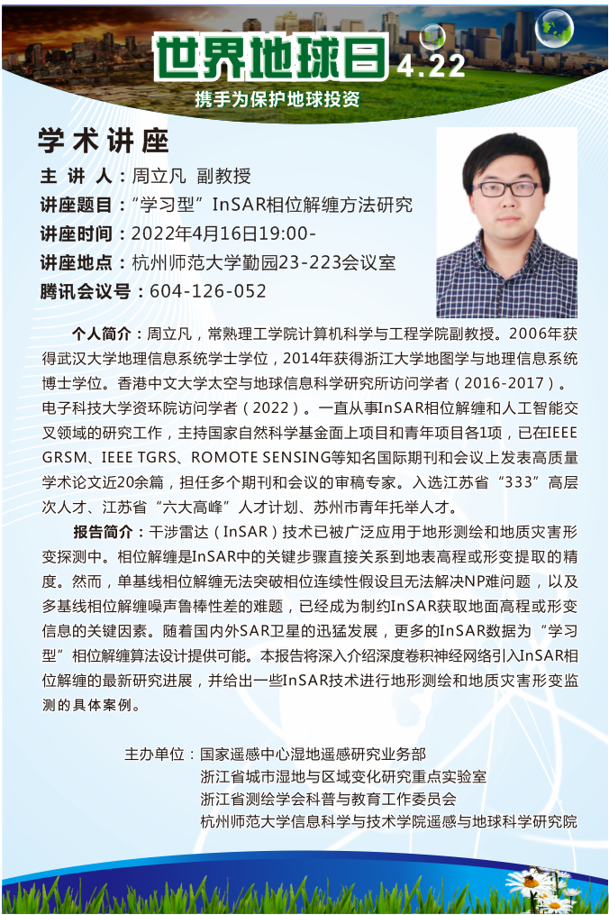 IT讲坛2022年第7期-‘学习型’InSAR相位解缠方法研究 时间:2022-04-13 16:03:40 文章来源 :学科 浏览量:14 常熟理工学院 周立凡副教授 关于“‘学习型’InSAR相位解缠方法研究”线上专题讲座开讲,欢迎广大师生参加。观看方法:下载腾讯会议APP或登录网页-点击加入会议-填写会议号604-126-052点击加入会议即可,或者直接点击//meeting.tencent.com/dm/SA0pIuqez6LC。