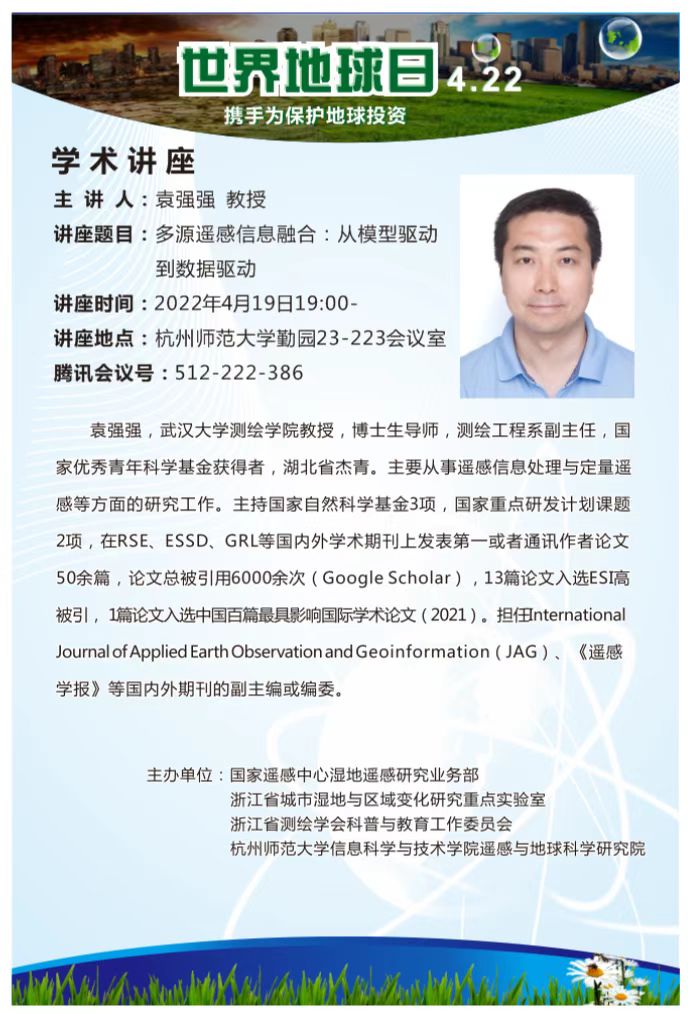 IT讲坛2022年第9期-多源遥感信息融合:从模型驱动到数据驱动 时间:2022-04-18 11:13:39 文章来源 :学科 浏览量:9 武汉大学 袁强强教授 关于“多源遥感信息融合:从模型驱动到数据驱动”线上专题讲座开讲,欢迎广大师生参加。观看方法:下载腾讯会议APP或登录网页-点击加入会议-填写会议号512-222-386点击加入会议即可