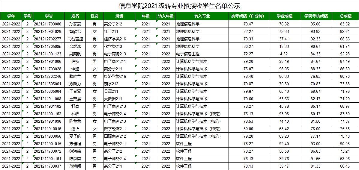 换妻 2021级转专业拟接收学生名单公示 时间:2022-06-28 10:15:12 文章来源 :教学 浏览量:1138 根据《换妻 本科生转专业实施办法》(杭师大教〔2020〕20号)文件和《换妻 2021-2022-2学期2021级转专业考核规则》的要求,学院根据文件规定的三部分成绩加和得出总成绩,总成绩60分以上的同学同意降级转入,现将拟接收名单予以公示。公示期即日始至7月1日下午12:00止。如有异议的请在公示期内联系学院教务科,28869830。