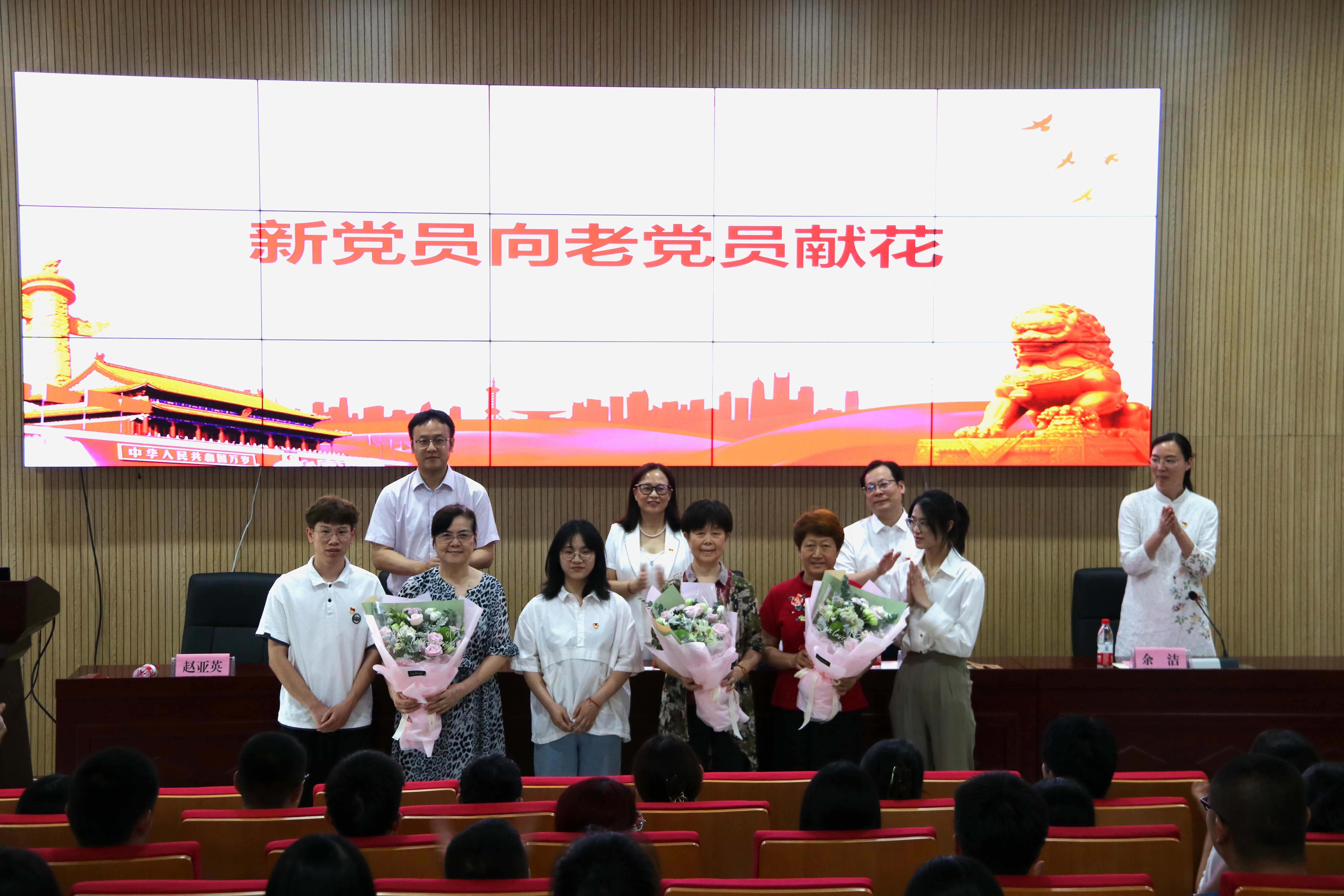 会议开始,在庄严肃穆的氛围中,与会全体党员起立齐唱国歌。随后开展了“新党员宣誓,老党员重温入党誓词”集体宣誓活动,由学院党委书记周春儿作为领誓人,全体与会党员面对党旗庄重立誓。然后,由新党员向学院退休老党员献花,象征新老党员薪火相传,党的精神和信仰生生不息。
