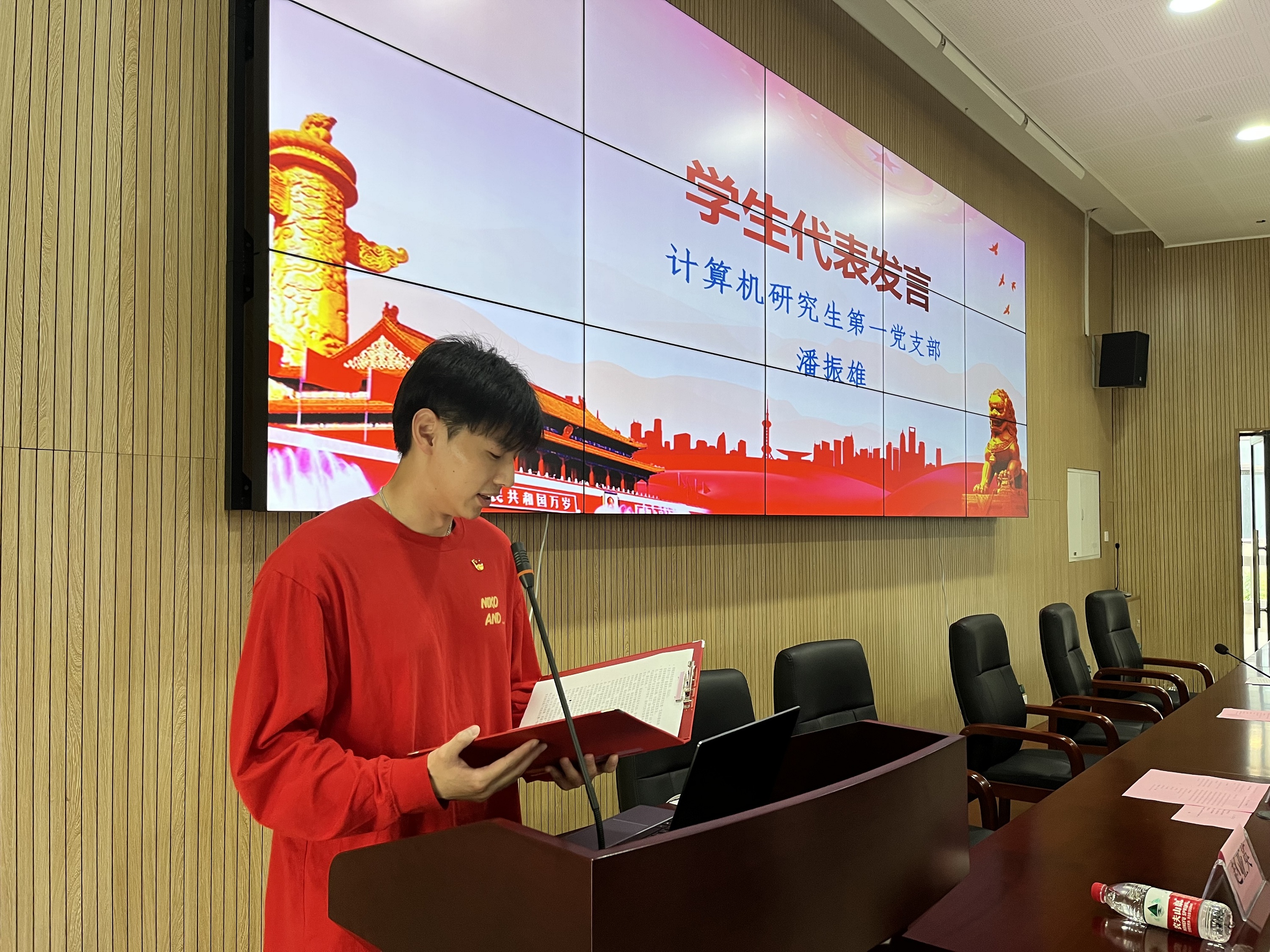 校微党课比赛一等奖获得者、计算机与金融服务系研究生第一党支部潘振雄同学作为优秀学生党员代表上台发言,他从做学习身边榜样的有心人、青年朋友的知心人、青年群众的引路人、基层建设的引路人等几个方面,分享了作为一名青年党员的责任担当,以及实现民族复兴道路上青年党员奋勇争先的远大志向。