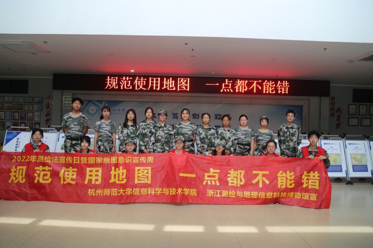 “一点一线皆是山河,一山一岛俱不退让”,今年8月26日至9月1日是我国第19个测绘法宣传日暨国家版图意识宣传周,恰逢杭师大2021级大学生正在开展爱国主义教育军事训练活动。近日,为进一步提升在校大学生的国家版图意识、倡导规范使用标准地图,杭师大空间信息技术协会联合浙江省测绘与地理信息博物馆举办国家版图知识展览进校园活动。本次活动采用线上线下结合的形式开展,包括全国测绘法主题宣传、国家版图知识展览、国家版图知识大闯关以及浙江省一等1km比长基线场参观。