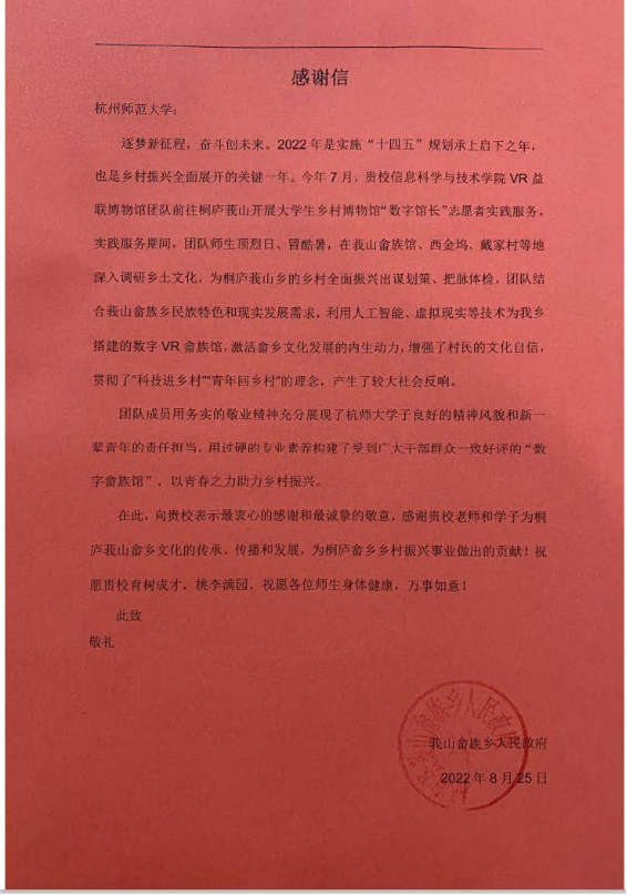 “贵校VR益联博物馆团队立足所学专业,发挥智慧才干,将理论付诸实践,为善琏的文化振兴与乡村建设事业提供了有效帮助……在此,向贵校表示最衷心的感谢和最诚挚的敬意,感谢贵校老师和学子为桐庐我山畲乡文化的传承、传播和发展,为桐庐畲乡乡村振兴事业做出的贡献!”