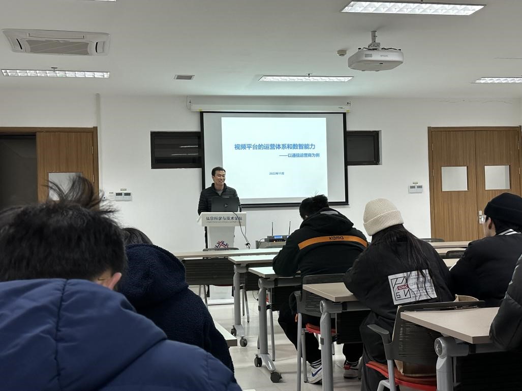 11月30日,中国移动杭州研发中心青年骨干人才储一鹏在勤12-204教室为换妻 学生带来职场分享讲座——以“视频平台的运营体系和数智能力——以通信运营商为例”为主。学院团委书记杨鹏飞老师到场参加并主持,学院70余名同学到场参聆听。