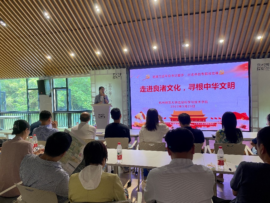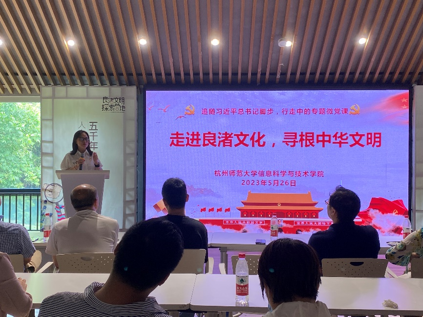 随后,院党委书记周春儿为在座党员带来微党课,她表示良渚古城遗址是中华民族五千年的实证,作为中华儿女应该为古人的智慧以及中国文明的源远流长而感到自豪,我们要加强文化自信。作为教育工作者,肩负着为祖国培养人才的使命,更要做文化的认同者、宣传者。接着,周书记对工匠精神表达了独到的见解,阐述了对古人的勤劳和智慧的传承,与当今科学精神铸就的关系,并鼓励大家发挥学科专业优势,积极参与古城的数字化建设。在景色宜人的环境下参观,周书记强调了人与自然和谐相处的理念,以及实现马克思主义与中国古代优秀文化相结合的重要性。最后,周书记还希望大家学习良渚古城申遗中的持之以恒与坚韧不拔的精神,积极为学校创一流及登峰工程、申博等贡献力量。