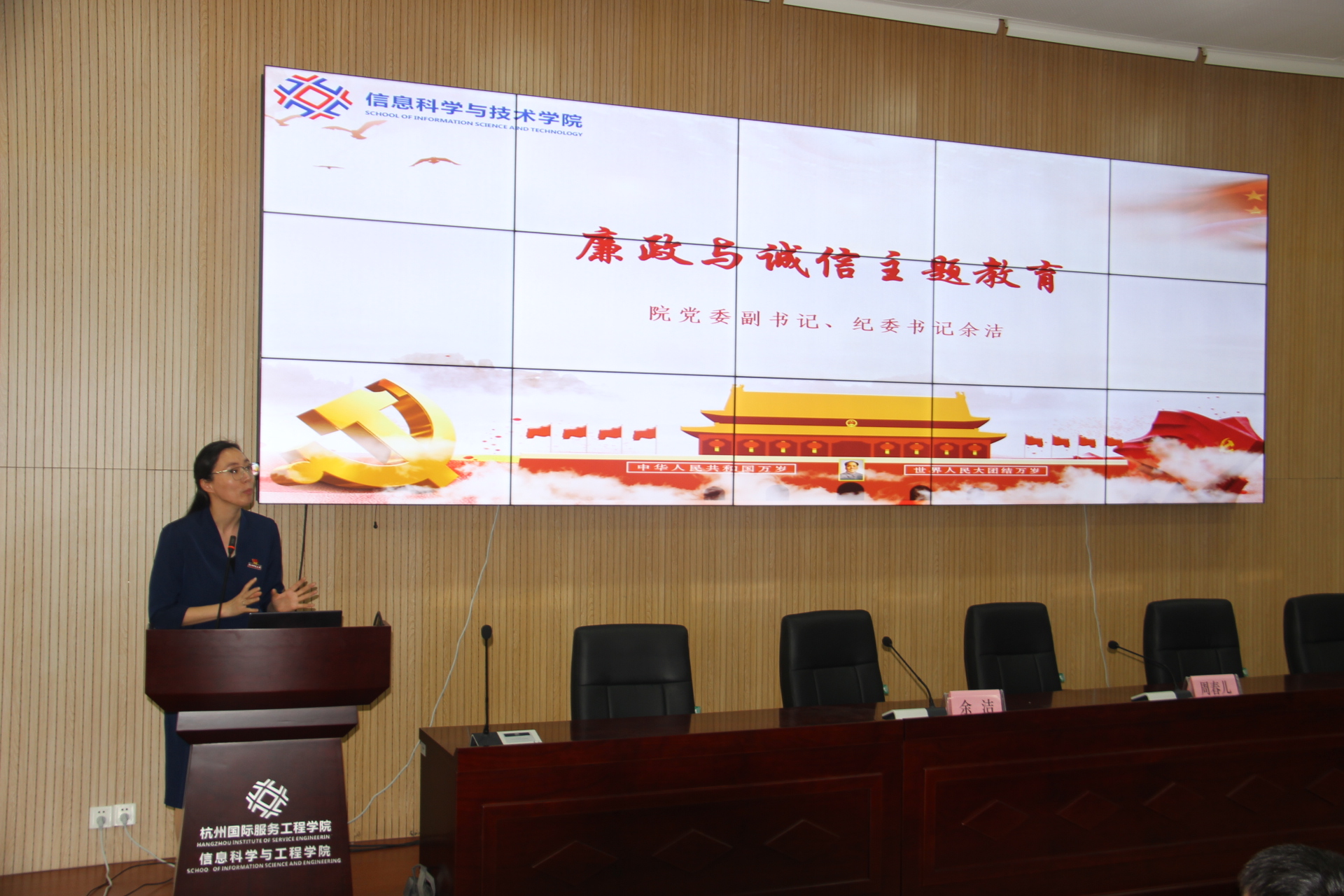 最后一节党课的第二项议程是由院党委副书记余洁向全体毕业生党员做了廉政与诚信主题教育。余书记用一句话向全体毕业生党员说明了作为一名廉洁、诚信的党员的要求:心有所畏,言有所戒,行有所止。这简简单单的十二个字,字字珠玑,向全体毕业生党员敲响了警钟,要求全体党员在离开校园、走向社会之后继续用高标准严格要求自己,做一名廉洁、诚信的优秀共产党员。