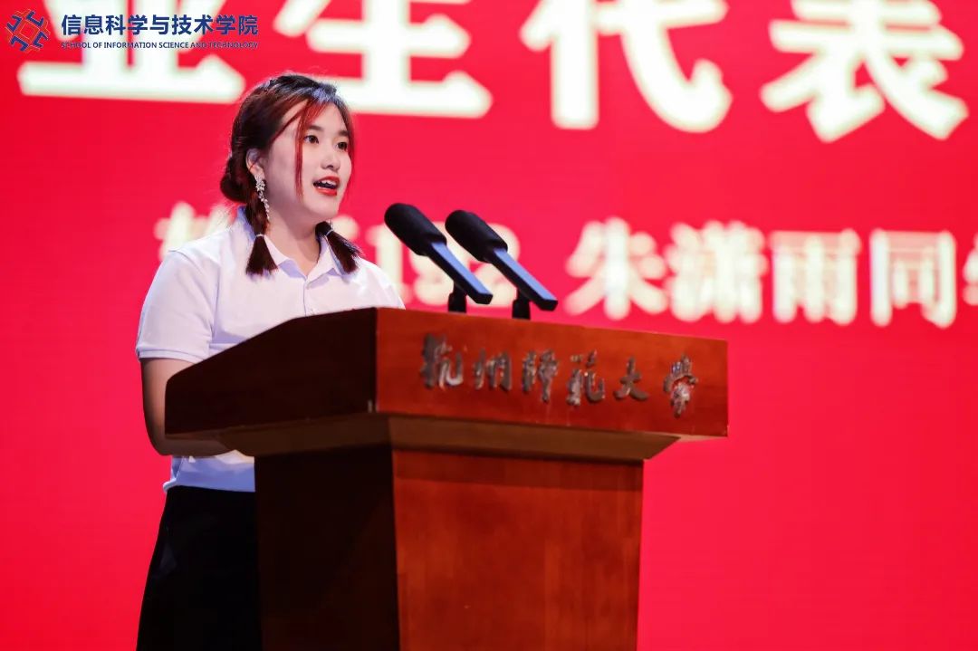 软工192班朱潇雨同学代表全体毕业生发言。她深深表达了对即将离开母校的不舍之情与对母校悉心照料的感激,回首了自己一路所历经的磨练与成长,真挚地感谢了一路相助的好友老师与伙伴。正如她所言:岁月安好,不负时光。四年大学时光承载了太多回忆,一幕幕场景就像一张张绚丽的剪纸画,串成一部即将谢幕的电影,记录着逝去的青春与过往,播放着曾经的快乐与忧伤,承载着大学里的点点滴滴与成长。在离别之际,朱潇雨同学代表全体毕业生,祝福母校继续熠熠生辉,同学们前途光芒万丈!