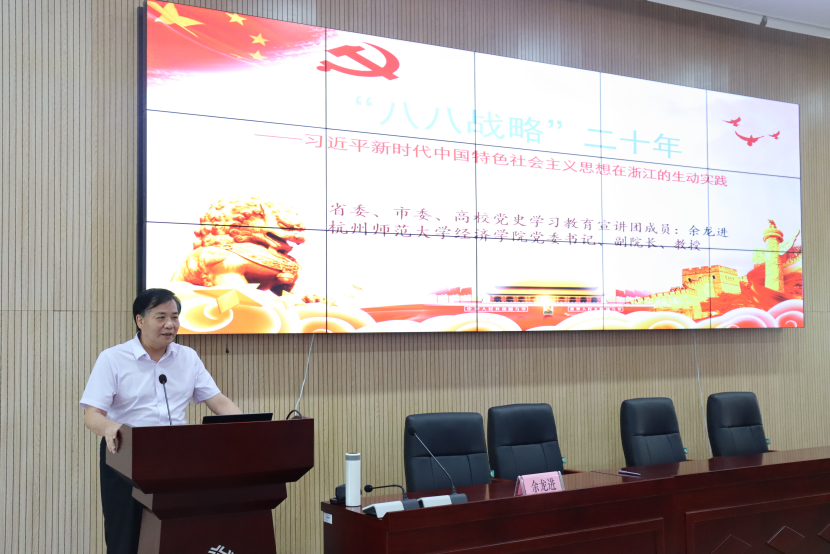 会议进入第二阶段,主题教育党课。今年是"八八战略"实施二十周年,学院邀请了校党委理论讲师团成员、经济学院党委书记余龙进教授,为大家带来了《“八八战略”二十年》的主题讲座。余教授具有丰富的学术背景和丰富的教学经验,他深入浅出地解读了"八八战略"的重要性和背景、丰富内涵、对浙江飞速发展的意义及哲学思考。