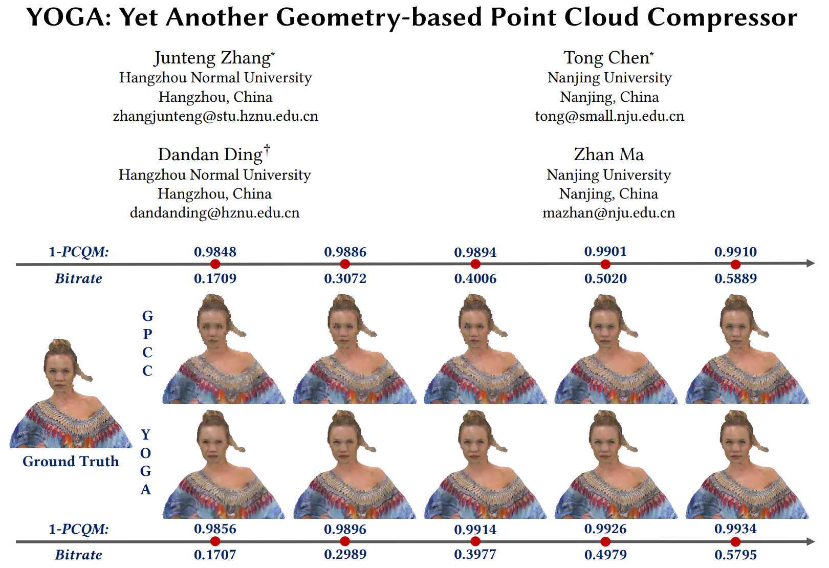 本文提出了一种基于学习的点云压缩方法YOGA。YOGA采用统一的基于端到端学习的方式来进行单独的几何和属性压缩,包括两层结构:在基础层使用G-PCC对下采样的缩略点云进行编码,并在G-PCC压缩先验的基础上,在增强层堆叠多尺度稀疏卷积,以有效地表征空间相关性对全分辨率样本进行压缩。此外,YOGA集成了自适应量化和熵模型组以实现可变速率控制,以及自适应滤波器以实现更好的质量恢复。YOGA在编码效率上显著优于最新的G-PCC压缩标准,例如,使用PCQM(点云质量指标)作为失真评估,BD-BR增益为25%。由于采用了稀疏卷积和并行熵编码,算法复杂度低,运行时间与G-PCC编解码器类似。