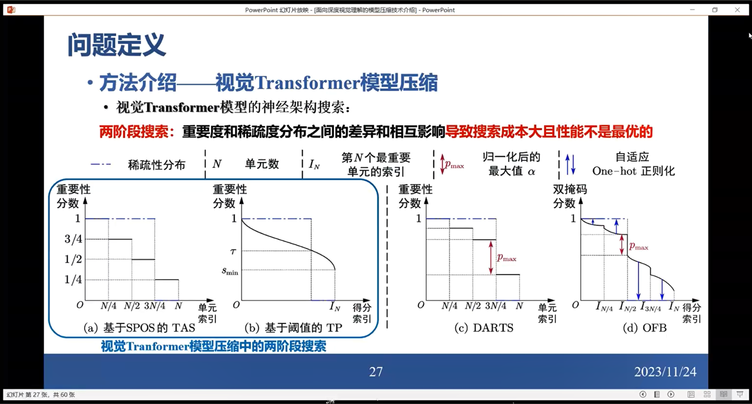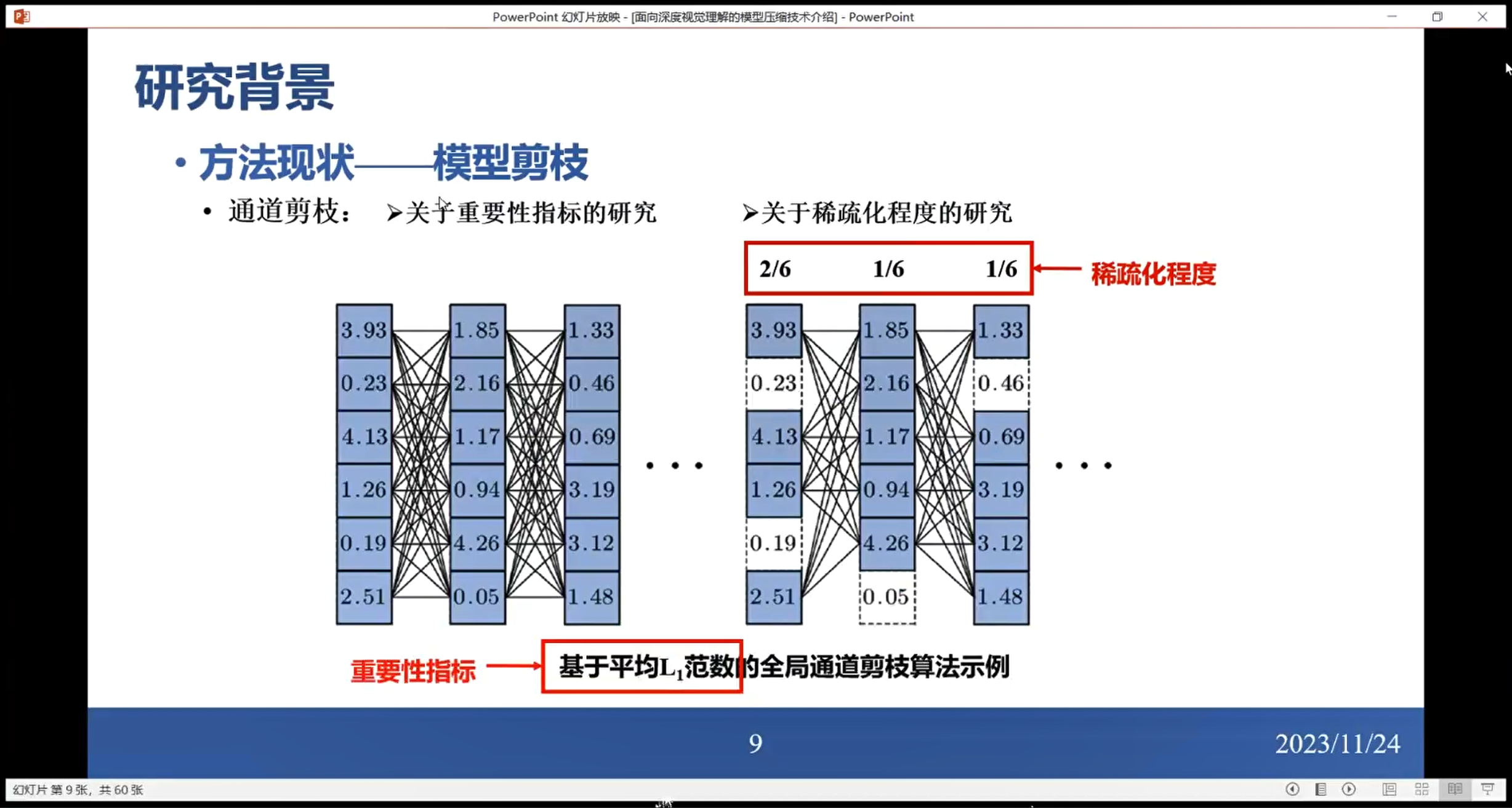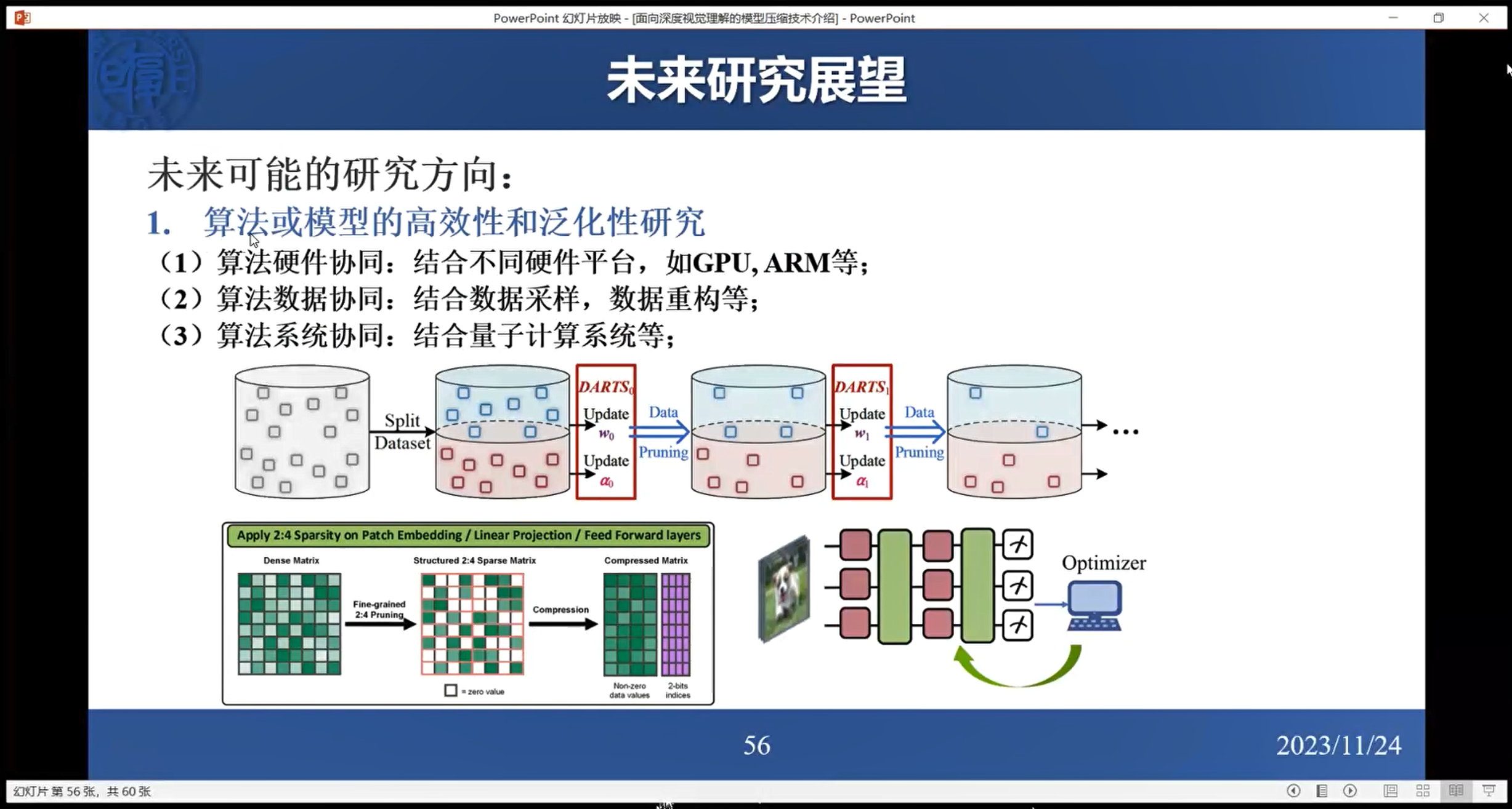 陈老师深入探讨了“面向深度视觉模型高效压缩技术研究”这一课题,将内容分成了三个重要部分,包括研究背景、研究内容、总结展望。