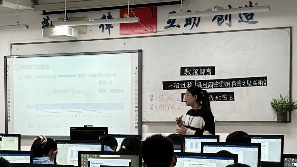 陈绮琪同学采用分组教学的方法,让学生完成对于数据解密的探索过程,并且拓展知识点,介绍多种加解密方式,使学生充分认识到发展自主可控技术的重要性。本节课的课程设计抓住教学重点,采用故事情境和分组教学充分调动学生积极性,不少老师对本节课给予好评。姚争为、石兴民老师对本节课做出评价,认为整节课课堂氛围活跃,学生在课堂上充分探索了数据解密过程,老师们也就信息科技新教材对学生和授课教师提出的新要求做出了探讨。