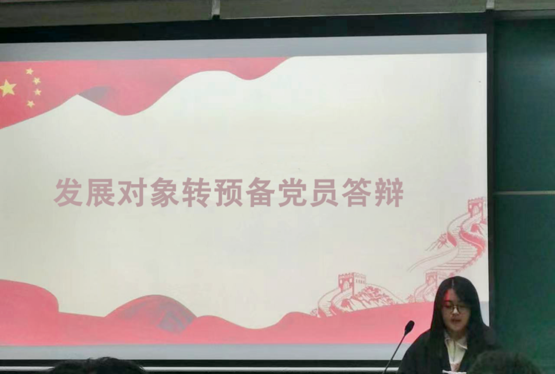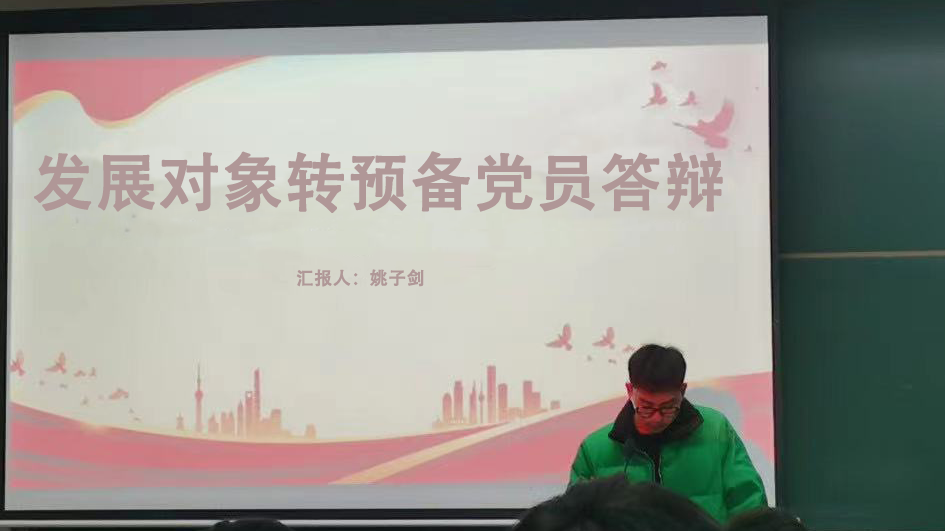 会议伴随着国歌拉开帷幕。会议伊始,党支部书记李俊杰老师汇报了2名发展对象的培养考察情况以及政审情况。2名发展对象依次上台汇报近一年的学习工作状况、入党初心、对党的认识、不足以及改进措施等,在会党员同志,对其能否成为预备党员表明态度。随后,支部大会成员进行无记名投票。经投票表决赞成人数超过应到会有表决权的正式党员的半数,吴希宁同志和姚子剑同志成功被接收成为预备党员。随后姚子剑同志和吴希宁同志依次发表了成为预备党员之后的计划与目标。