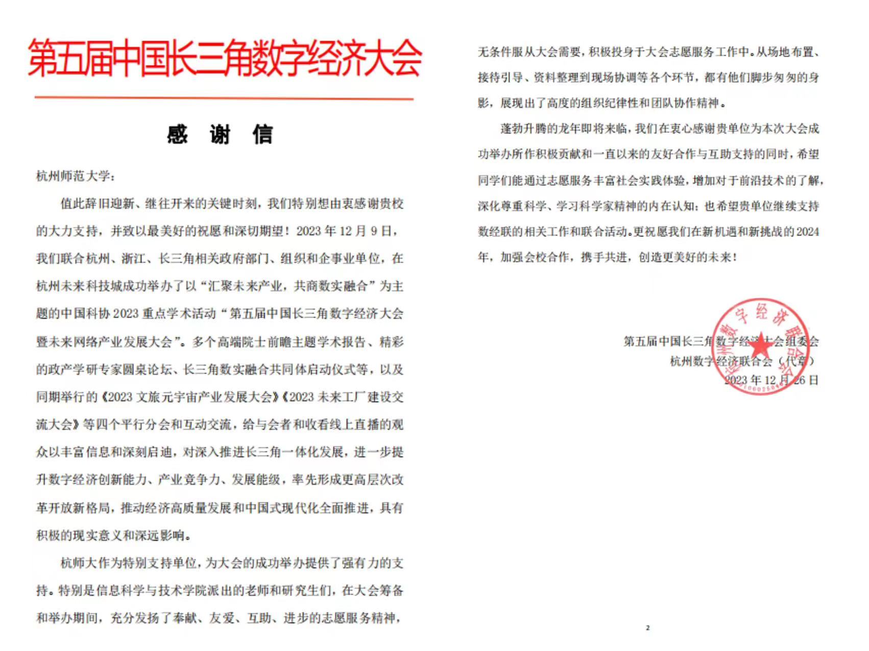 换妻 收到第五届中国长三角数字经济大会感谢信