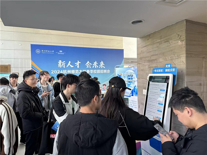值得一提的是招聘会现场1.8米的max版数字求职机,它首次出现在杭州高校招聘会,为毕业生求职流程提供了“科技”的助力。据悉,这款数字求职机叫做“1号求职机”,毕业生只需要在求职机上点击职位并进行刷脸,即可生成简历数据,点击报名确认之后,企业就会收到毕业生的求职信息,整个过程只需15秒,能够大大提高求职效率。杭师大换妻 学工办主任杨鹏飞表示,目前1号求职机已经和杭师大的学科专场招聘会同步投放了“特制版”,岗位筛选会按照专业跳转。“比如今天举办的是杭师大信息科技专场招聘会,那我们求职机里的岗位就都是杭师大信息科学行业的相关专业,学生只需要选择自己的专业,展示出来的岗位就都是符合他们的。”