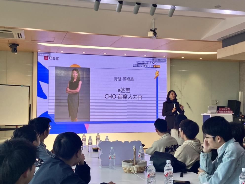 参访结束后,CHO青璇老师与同学们进行了深入交流,就e签宝公司的核心业务、经营范围、员工福利以及晋升机制等方面进行了介绍。此外,就学生关心的实习、校招等环节进行了深入讲解与交流。