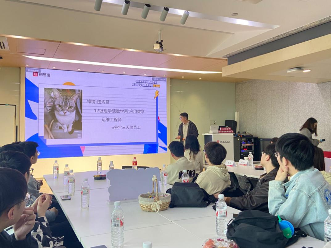 最后,到了校友分享环节。毕业于杭师大理学院的12级校友田均昌目前担任e签宝的运维工程师,他和大家介绍了自己的求职经历和心路历程、成长收获,引起了同学们的深深共鸣。毕业于学院19级计算机科学与技术专业校友俞佳权前一段时间入职e签宝企业,作为刚走出大学校门走上社会的毕业生,俞佳权向同学们提出几点建议:一是打好基础,学好数据结构等专业课;二是找准目标,选择做程序员最好在大三就投入实习,积累经验;三是不要焦虑,要找到自己喜欢的方向。