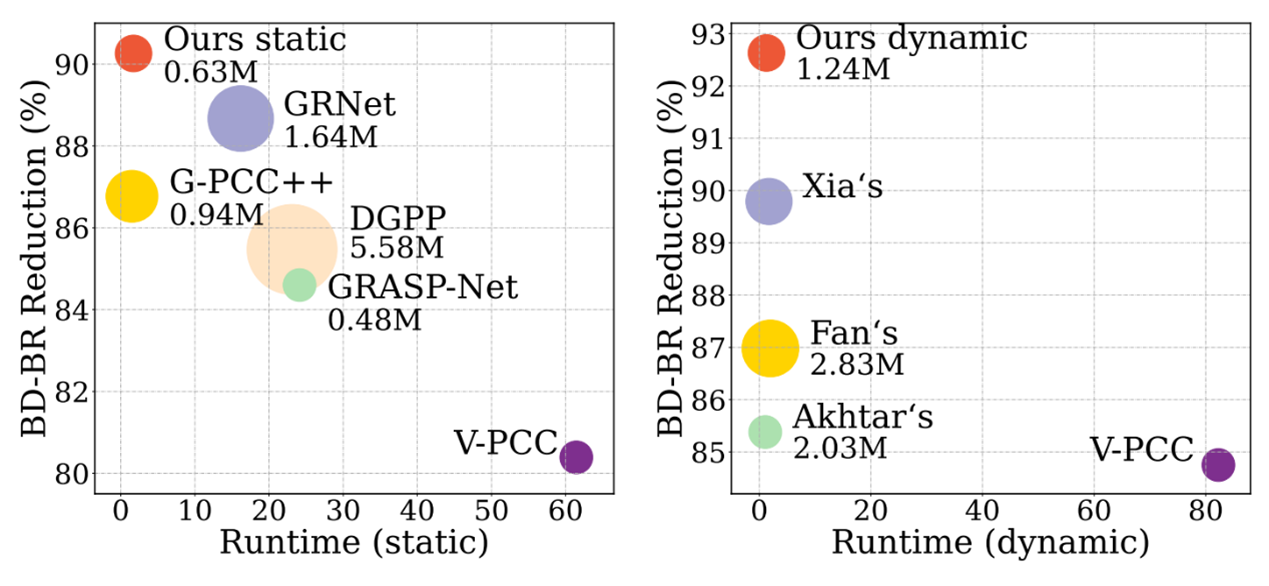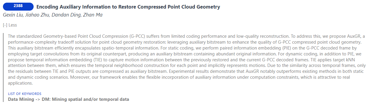 MPEG提出的基于几何的点云压缩方法(G-PCC)存在编码性能有限和重建质量低的问题。因此,旨在解决上述问题,本文提出了AuxGR用于点云几何重建。AuxGR利用辅助比特流来增强G-PCC压缩点云的几何质量,其中辅助比特流包含了点云时间和空间域的信息。具体地,对于静态编码,我们通过使用目标卷积在G-PCC解码帧上进行空间信息嵌入(PIE),从而产生包含丰富原始信息的辅助比特流。对于动态编码,使用时间信息嵌入(TIE)来捕获参考帧的和G-PCC解码帧之间的运动信息,TIE使用基于领域的注意力机制,为每个点捕获运动信息,准确构建了时间邻域。实验结果表明,AuxGR在静态和动态编码场景下明显优于现有方法,相比于静态G-PCC,在D1(D2)上获得了90.76%(83.62%)的增益,相比动态G-PCC获得了92.27%(88.80%)的增益,同时,AuxGR拥有最低的复杂度,符合点云领域的实际应用。