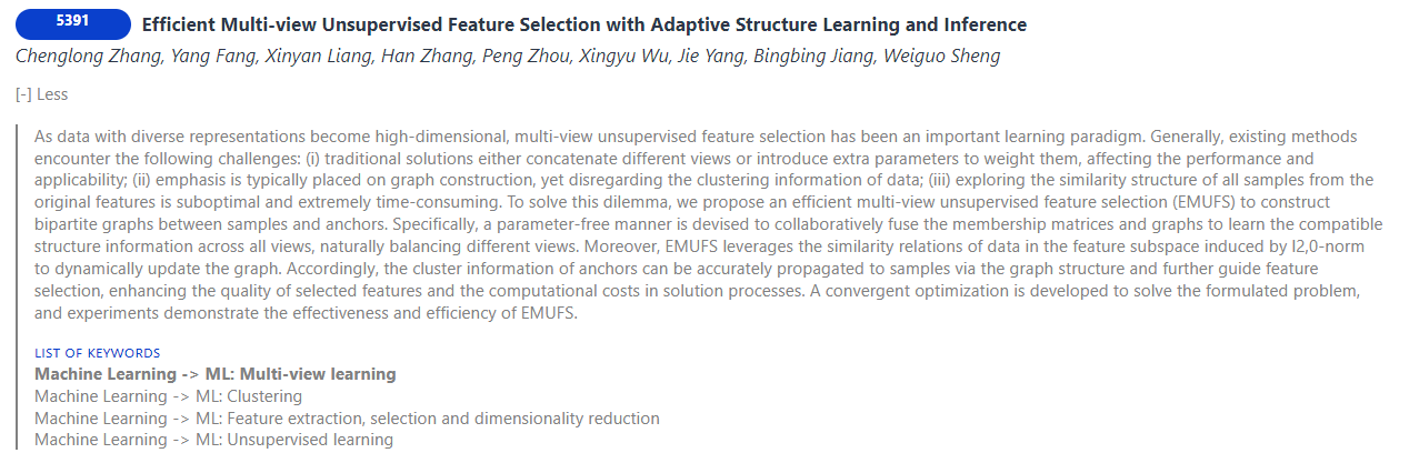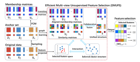 随着多视图数据的涌现,多视图无监督特征选择已成为一个重要的学习范式。然而,现有方法通常面临以下挑战:(i)传统方法要么将不同视图简单拼接,要么引入额外参数进行加权,影响了性能和适用性;(ii) 现有方法侧重于构建图来挖掘近邻信息,忽略了数据的聚类信息;(iii)从原始特征中学习所有样本的近邻结构容易收到噪声特征的干扰且极其耗时。针对上述问题,本文提出了一种高效的多视图无监督特征选择方法(EMUFS),设计了一种无需额外参数的方式来协同融合隶属度矩阵和近邻图,以学习跨视图的兼容结构信息,利用特征子空间中的近邻信息动态更新图结构。因此,锚点的聚类信息能够通过图结构准确传播到训练样本,并进一步指导特征选择,从而提高所选特征的质量并降低求解过程中的计算成本。(图/文 洪东招)