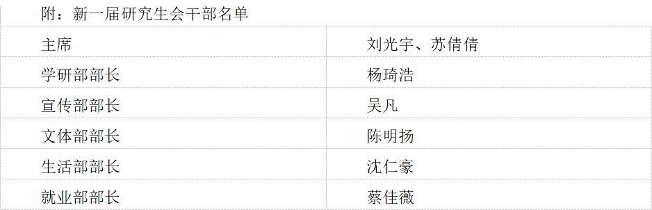 通过这次研究生代表大会,研究生会不仅系统地总结了过去一年的各项工作,还清晰地制定了未来的行动计划和目标。今后,研究生会将继续保持团结,积极参与和组织学院的各类活动,为学院的发展注入新的活力和智慧。我们坚信,在学院领导、辅导员和全体研究生的共同支持下,研究生会的未来将更加辉煌。(文/苏倩倩 图/陈明扬)