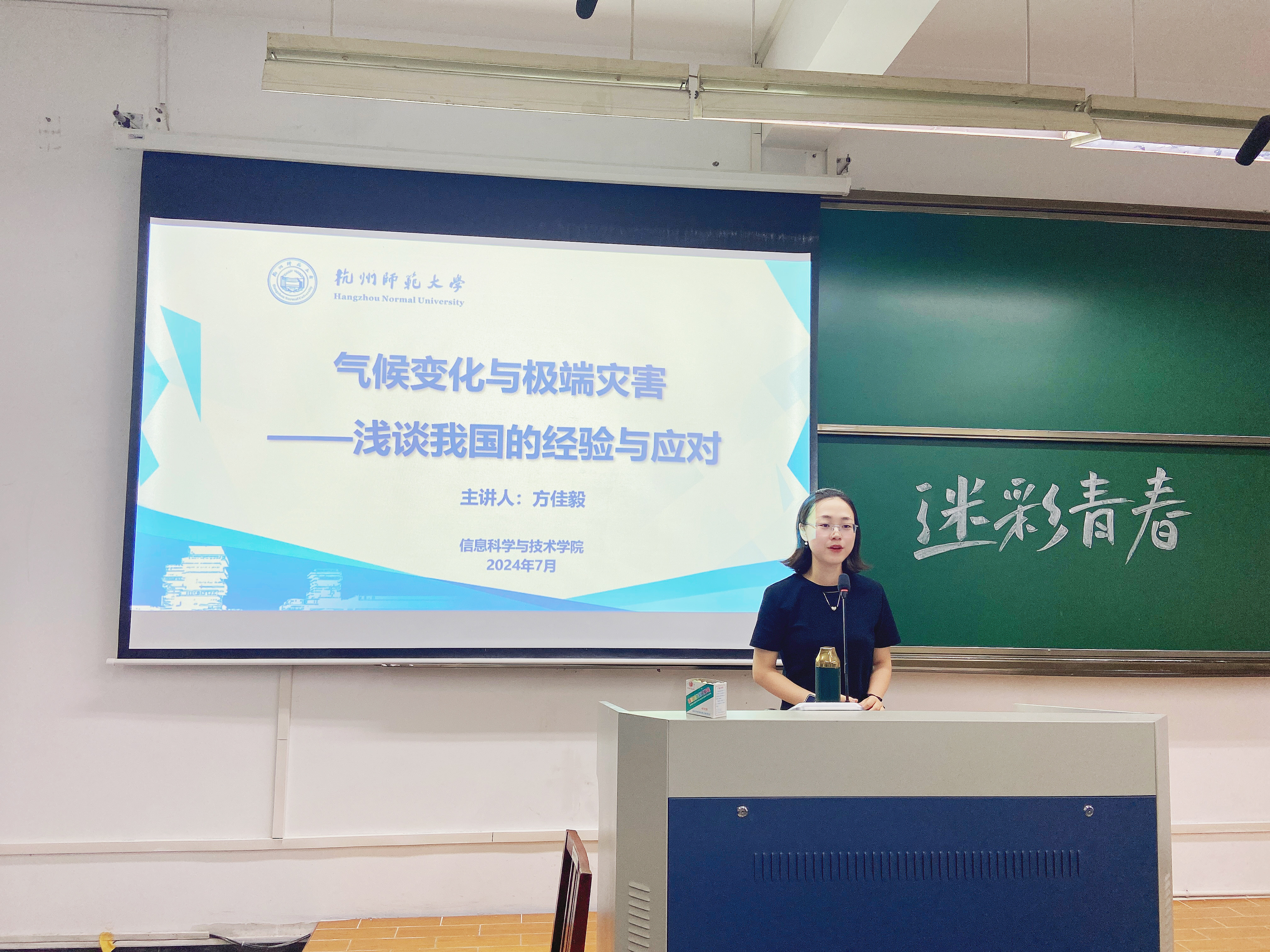 为加强和巩固专业素养,提高学生应对气候变化的意识,2024年7月8日,换妻 党委青年博士讲师团成员、换妻 遥感地学系方佳毅副教授,以“气候变化与极端灾害--浅谈我国的经验与应对”为题,在下沙校区给2023级学生开展一场别开生面的讲座,本次讲座由学工办彭学义老师主持。