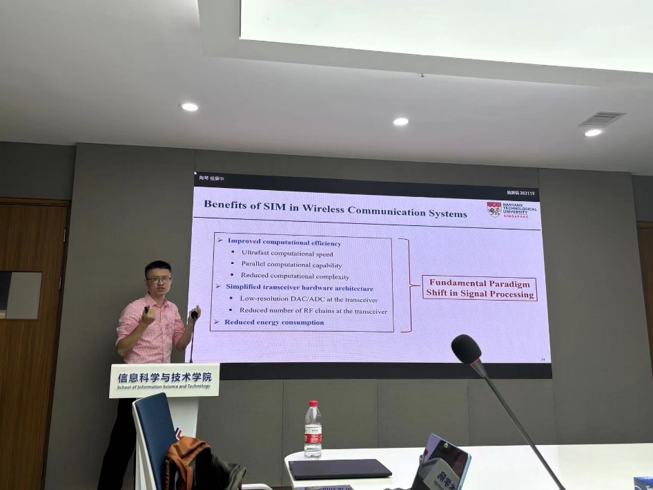 本次报告,Chau Yuen博士介绍了一种新型堆叠智能超表面(SIM)赋能的波束域计算架构,以实现在电磁(EM)域中联合信号处理和通信。其中,SIM由一系列可编程超表面层堆叠制成,每一层由许多低成本的无源超原子组成,这些超原子可以单独操控EM波。通过适当配置这些无源超原子,当EM波通过SIM时,它可以自动完成高级计算任务,同时减少能耗和处理延迟。在这次讲座中,Chau Yuen博士主要展示了SIM在多输入多输出(MIMO)和多用户MIMO无线通信中的应用。报告结束后,在座师生就关心的问题积极提问,Chau Yuen博士耐心细致地答疑解惑。