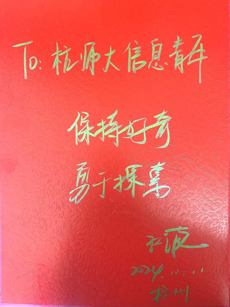 现场,江波还为学生签赠题词:”保持好奇,勇于探索!”,他希望年轻一代的大学生能把科幻作为思考方法,发现改变现实的力量,共同迎接人工智能时代的辉煌前景。来自物理师范专业的小钱同学从小就怀揣着成为一名科幻作家的梦想。初中时期,她尝试撰写近20万字的作品,但学业压力让她暂时搁置了这个梦想。这次讲座重新点燃了她的激情,尤其是将科幻创作与物理教育相结合的想法。