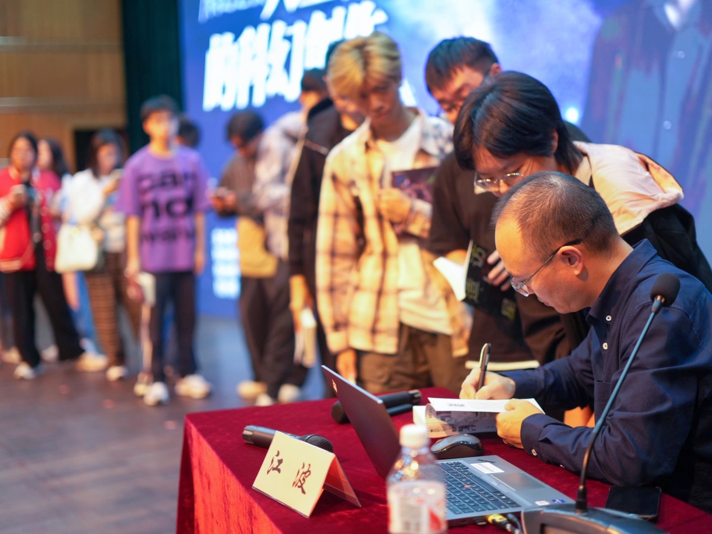 现场,江波还为学生签赠题词“保持好奇,勇于探索”!他希望年轻一代的大学生能把科幻作为思考方法,发现改变现实的力量,共同迎接人工智能时代的辉煌前景。来自物理师范专业的小钱同学从小就怀揣着成为一名科幻作家的梦想。初中时期,她尝试撰写近20万字的作品,但学业压力让她暂时搁置了这个梦想。这次讲座重新点燃了她的激情,尤其是将科幻创作与物理教育相结合的想法。