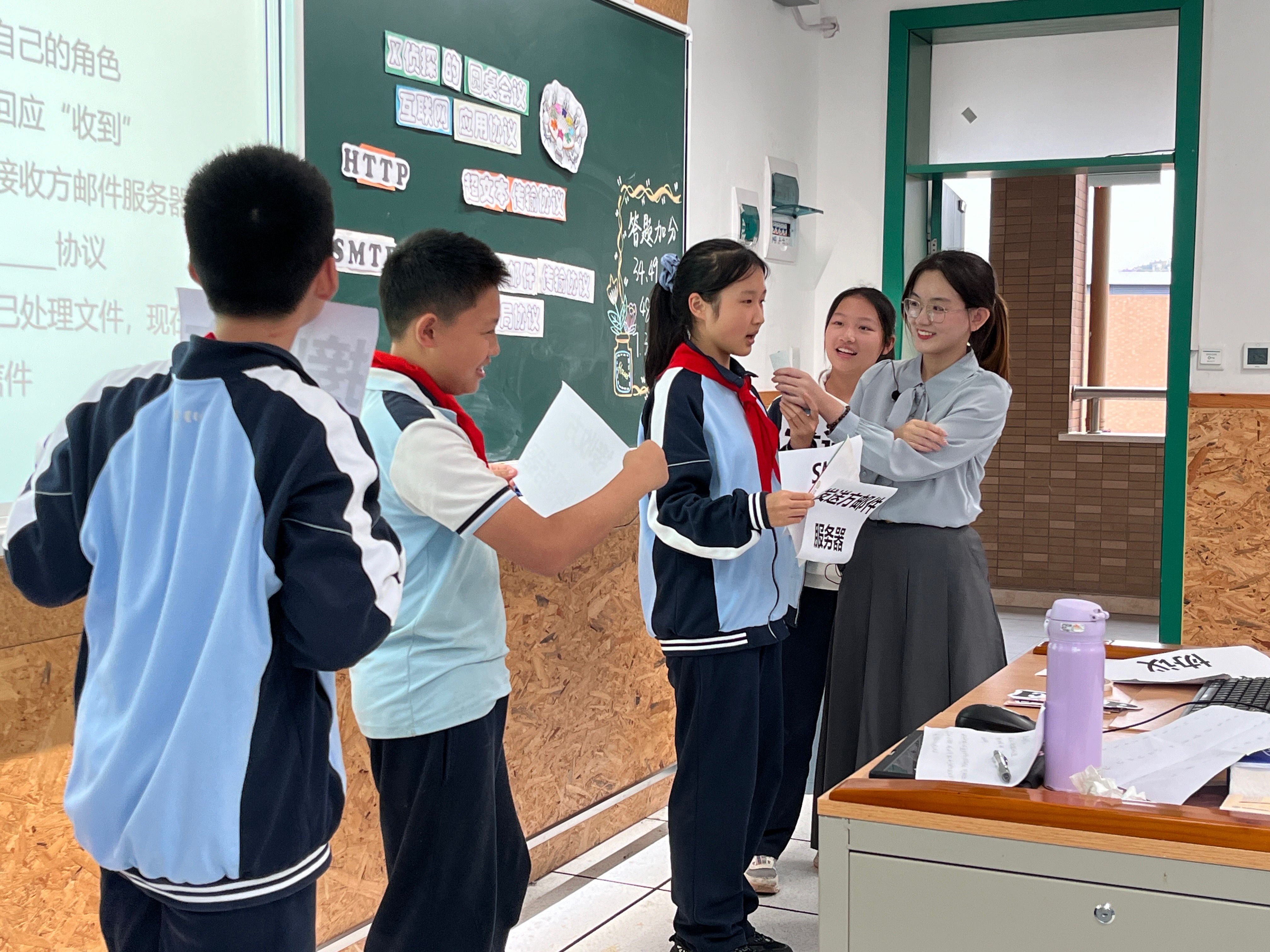 11月14日,学院2021级计算机科学与技术(师范)专业在崇德中学的实习生进行了公开课展示,李好璐同学讲授七年级课程《互联网应用协议》,朱梦茜同学讲授八年级课程《数据备份与加密》。学院党委书记周春儿、学院副院长姚争为带队近三十位学院教师前来观摩和指导。