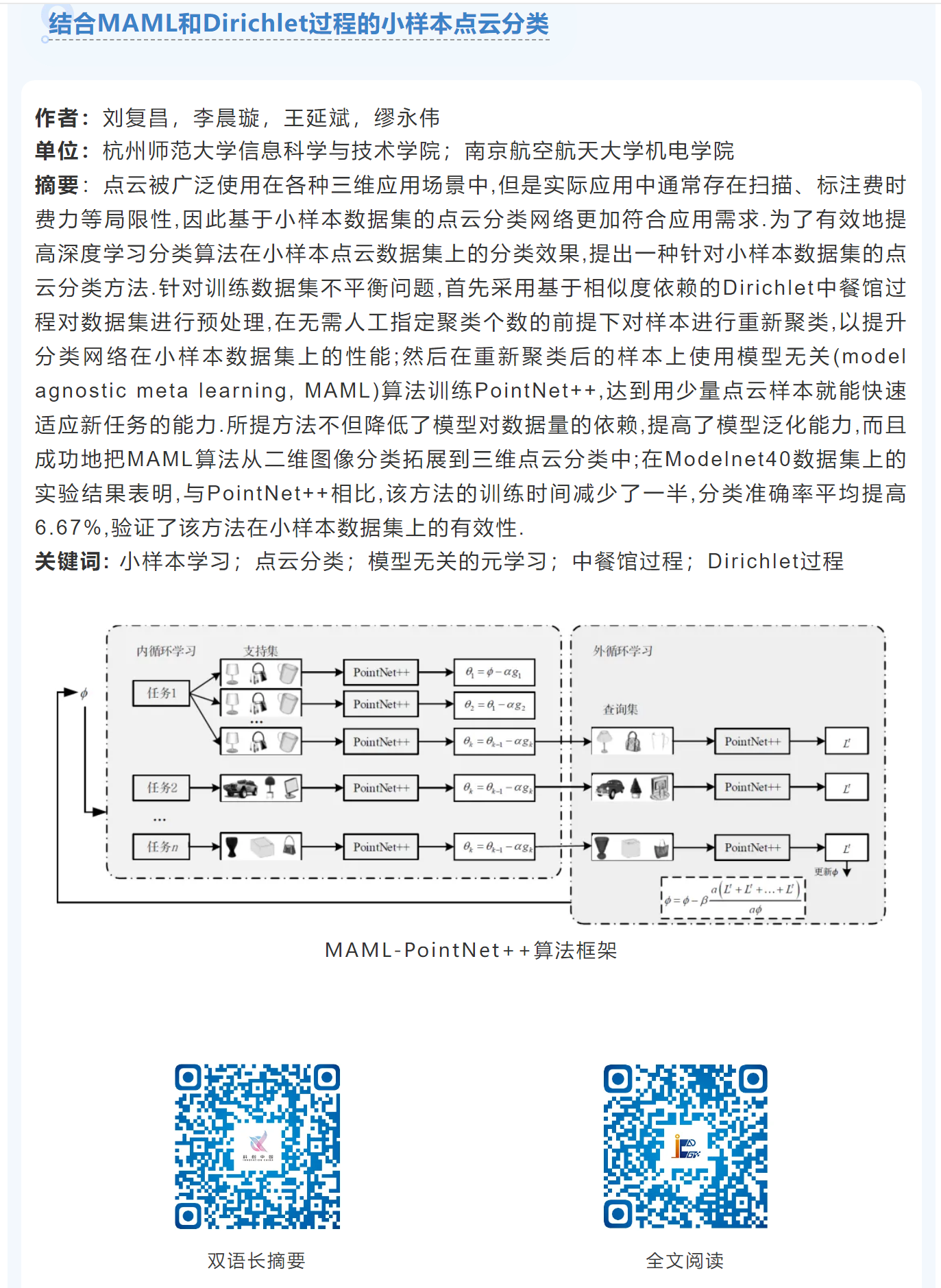换妻 刘复昌副教授(第一作者)、 李晨璇(研究生)、缪永伟教授(通讯作者)等人在《计算机辅助设计与图形学学报 》发表的研究论文“结合MAML和Dirichlet过程的小样本点云分类”成功入选2024年“长摘要双语传播工程”。(文/图 洪东招)