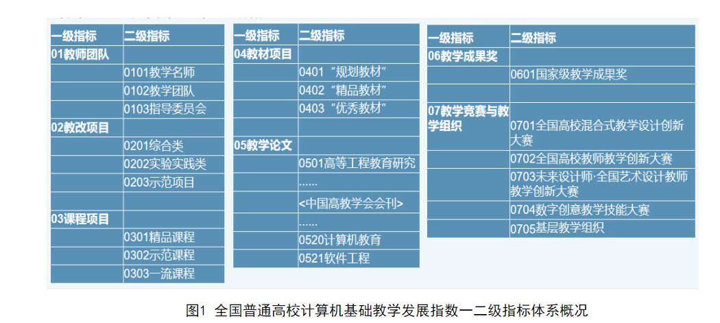 本次发布的指数,是研究会通过不同的视角分析,以及对文献梳理和分析,结合前期的调研、多次讨论和征求专家意见,梳理出能代表高校计算机基础教学发展的八个指标维度,作为评价体系的一级指标,分别是:教师团队、教改项目、课程项目、教材项目、教学论文、教学成果奖、教学竞赛与教学组织、通识类计算机竞赛。其中,前七个指标主要考察教师层面的数据,而“通识类计算机竞赛”考察学生层面的数据。在确定一级指标之后,根据40多年来我国计算机基础教学发展实际,继续细化二级指标和三级指标,最终形成涵盖“7+1”个一级指标、33个二级指标和64个三级指标的高校计算机基础教学发展指标体系。(图/文 李俊杰 杨鹏飞)