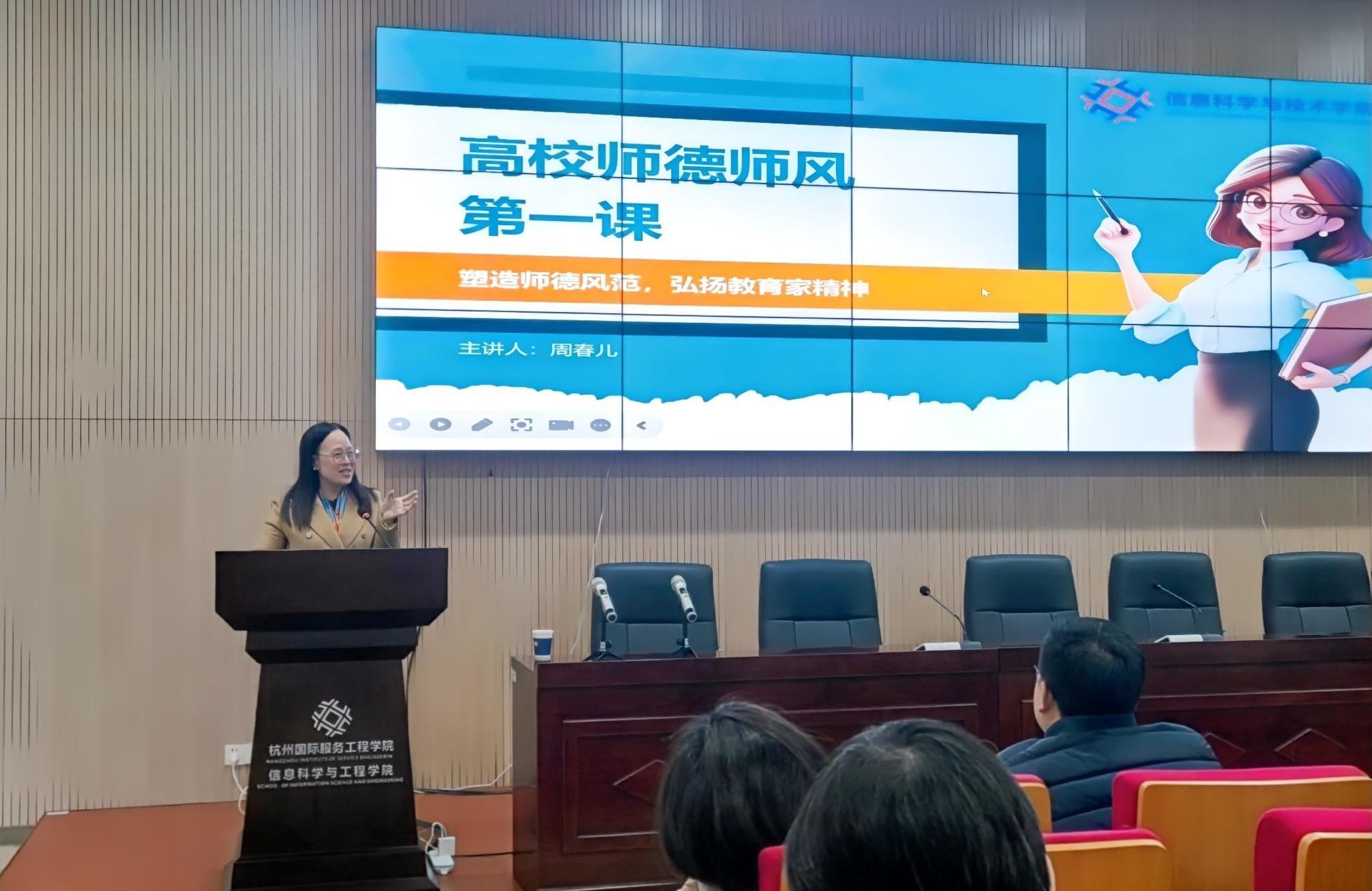 最后,党委书记兼副院长周春儿详细解读绩效工资实施办法、公用房相关政策变化,并以“塑造师德风范 弘扬教育家精神”为主题,开展师德师风第一课。她强调,要做好三全育人,即全员、全过程、全方位育人,以及提升学生核心素养的重要性;强调学术诚信和教师在新时代下的角色重塑,尤其是在人工智能背景下,教师应具备更高的思想政治工作和管理水平。此外,还就学院党政工作要点进行了任务布置。