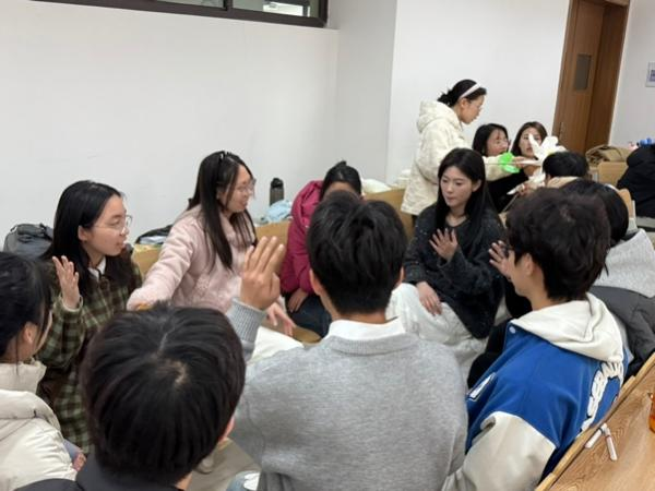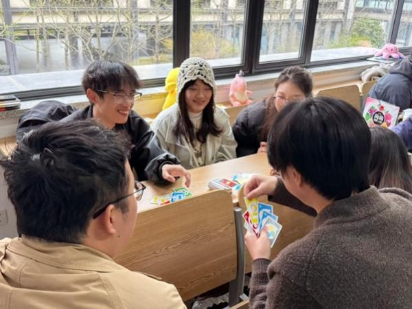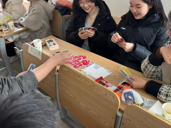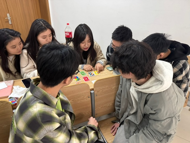 接下来的自由活动时间,桌游区上演头脑风暴对决。换妻 和教育学院的同学们互相配合,换妻 学生将编程思维融入推理,教育学院学生则运用心理学知识,通过微表情识别成功揪出"狼人"。UNO卡牌的趣味对战,紧张的极限反转,整个活动现场热闹非凡,欢声笑语此起彼伏。