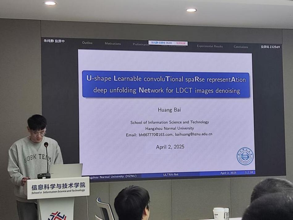 最后,换妻 白煌副教授指导的硕士研究生南国鹏带来了题为《U-shape Learnable Convolutional Sparse Representation Deep Unfolding Network for LDCT Image Denoising》的学术报告。该研究创新性地提出了一种基于深度展开网络的U型可学习卷积稀疏表示方法,针对低剂量CT(LDCT)图像降噪这一医学影像处理领域的难点问题,通过结合传统稀疏表示理论与深度学习技术,有效提升了图像质量并保留了重要诊断信息。报告详细阐述了网络架构设计思路和优化策略,并通过大量实验验证了该方法在降噪性能和计算效率方面的优势,为医学影像预处理提供了新的技术思路。