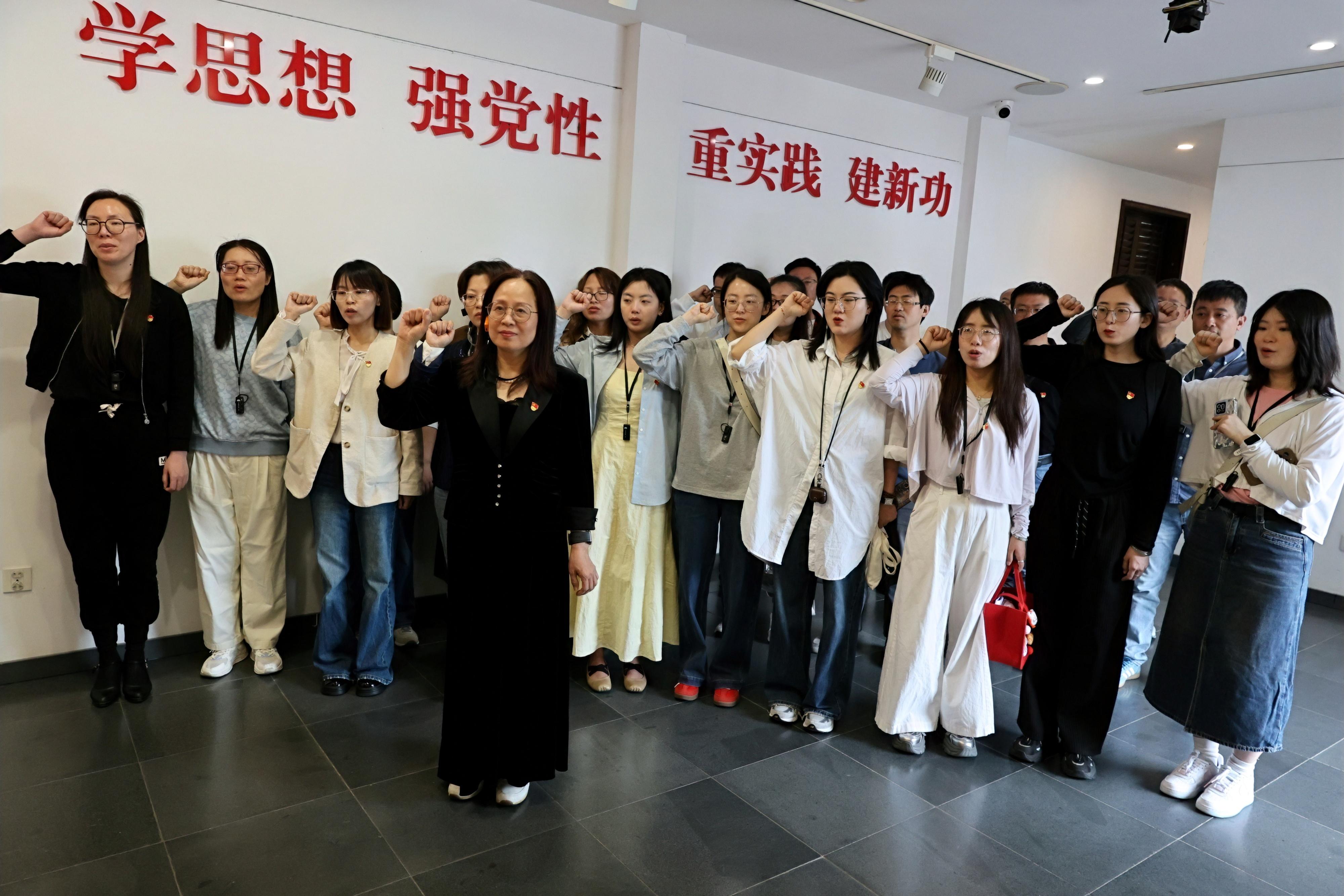 “我志愿加入中国共产党……”在鲜红的党旗前,全体党员干部在党委书记周春儿的带领下重温入党誓词。铿锵有力的宣誓声在展厅回响,彰显着新时代教育工作者为党育人、为国育才的坚定信念。