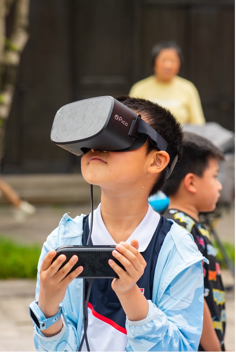 “云瞰西溪・全景绿境方舟”板块中,研究院提供的无人机低空测绘数据与VR技术相结合,将西溪湿地全景呈现在大屏幕上。小朋友戴上VR眼镜,仿佛漫步湿地,穿梭于各个景点。这一体验不仅让大家直观感受湿地之美,更展示了科技与自然融合的魅力,让体验者如同身临其境。