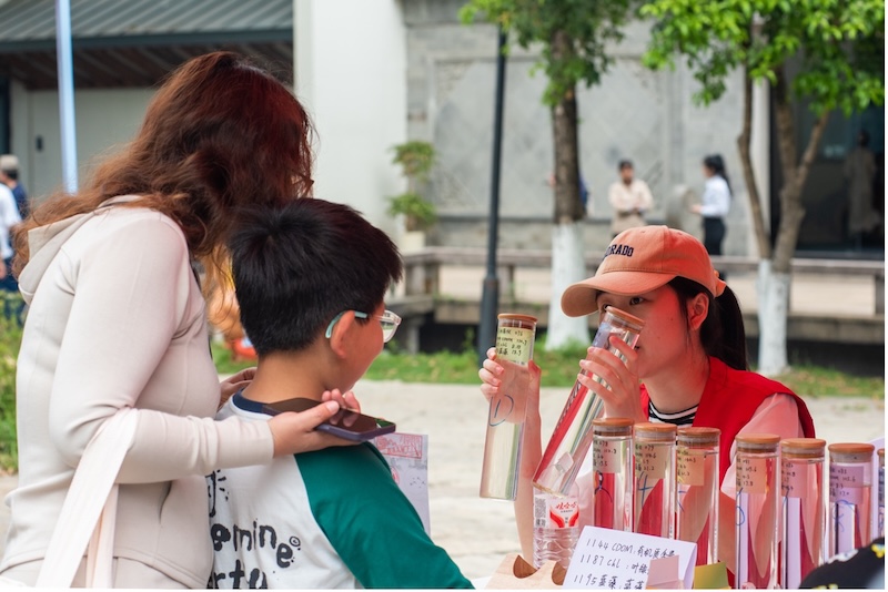 “智趣擂台・知识问答挑战”环节,50道环保知识题通过抽小球随机抽取,参与者踊跃答题,巩固环保知识。“涟漪方程式・碧波实验室”则让观众亲自参与湿地水质观测。排列整齐的透明试管中,是来自西溪湿地的不同点位采集的水样。研究院的科研人员现场指导,从采样到分析,分享在水质监测研究中的经验与方法,帮助大家理解水质监测数据背后的生态含义,感受科学探索的严谨,明白保护水资源的意义。