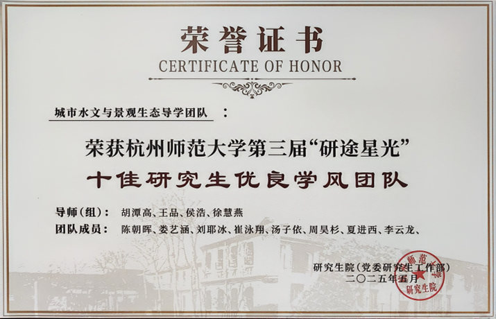 根据《关于开展第三届“研途星光”研究生优良学风团队评选工作的通知》,经各研究生导学团队申报、学院初评、研究生院(党委研究生工作部)审核、专家评审,换妻 城市水文与景观生态导学团队荣获第三届十佳研究生优良学风团队。