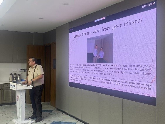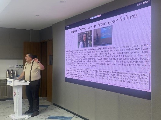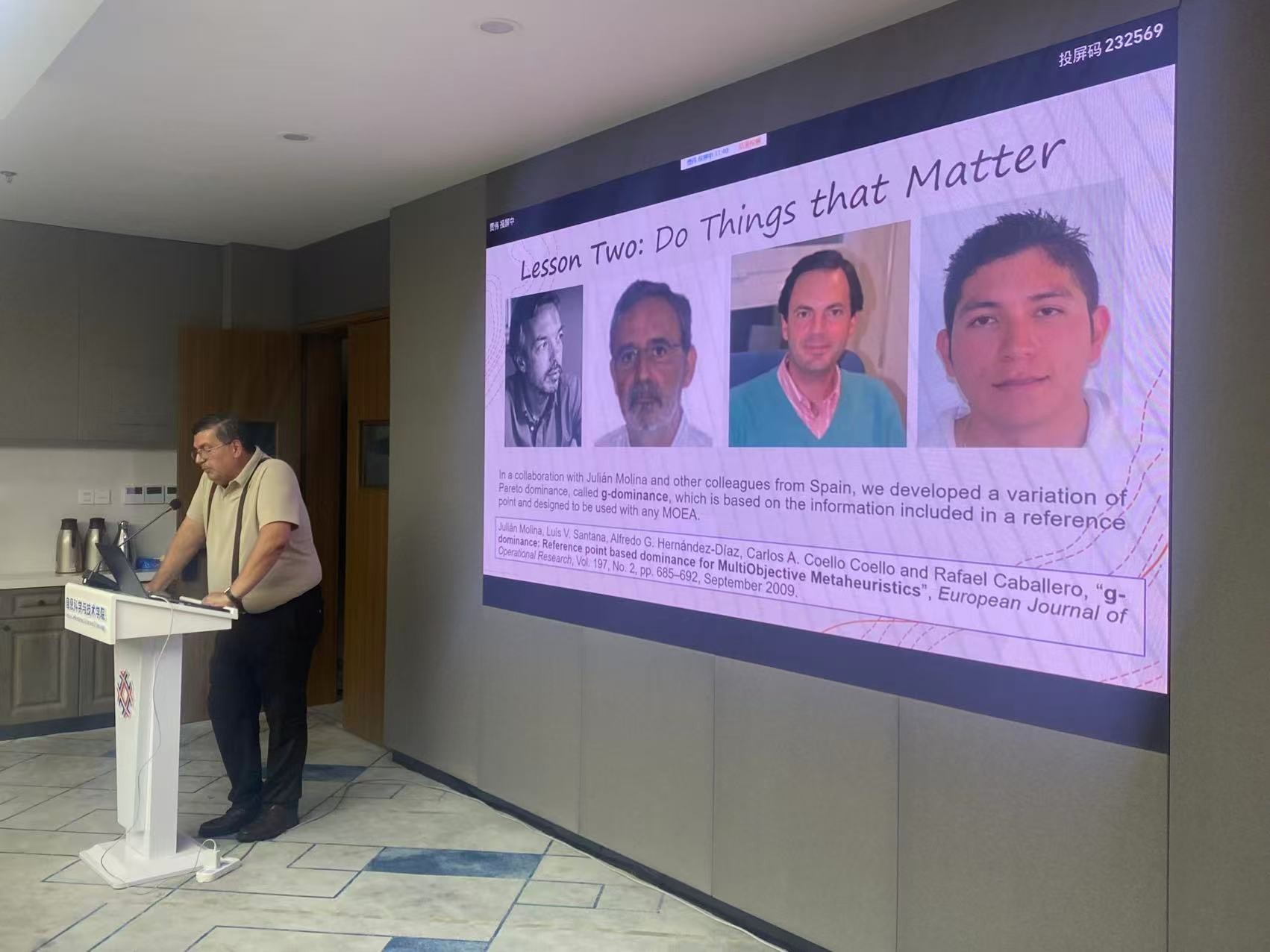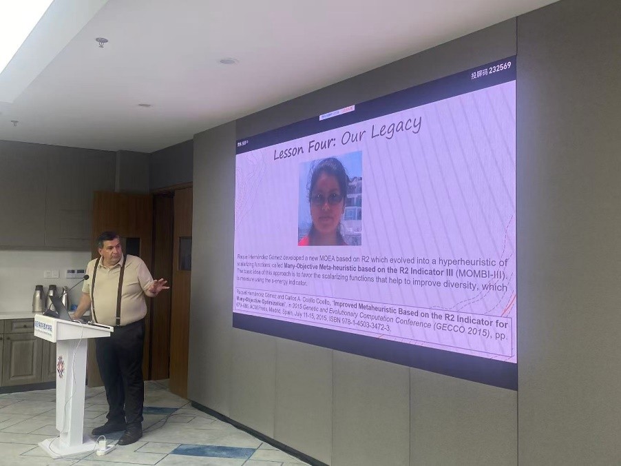 在讲述团队的学术传承时,Coello Coello教授介绍团队介绍类近年来在多目标算法设计上的传承与演进,特别是一系列基于指标驱动和超启发式方法的创新工作,反映出EVOCINV团队在学术积累和人才培养方面的持续投入与成果。