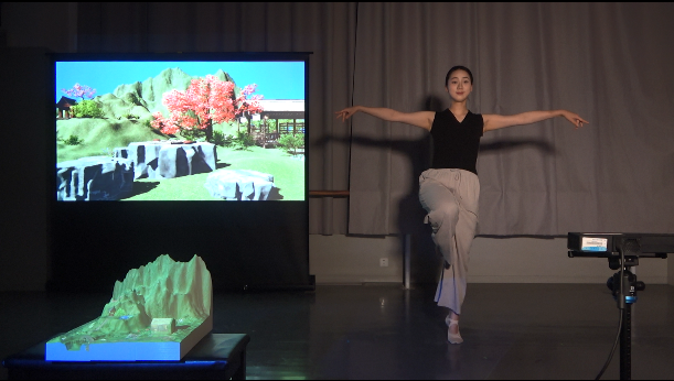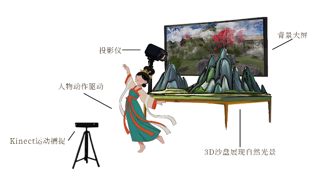 本作品是一个用户行为驱动的声音交互沙盘,以“数字共振”为技术内核,将物理规律、哲学思想与人文体验融为一体,演绎“天人合一”的古老智慧。装置通过实时捕捉用户身体姿态,演绎中国传统音乐,同时触发实物沙盘中山水、花鸟的同频共振,以及四季更迭、昼夜更替等自然现象。团队利用AI算法对Kinect人体运动数据进行分类识别,使用Unity和3ds Max进行场景建模,通过FL Studio、Max/MSP处理和创作音乐素材,再经UDP传输触发Unity及沙盘实景变换。本作品未来可作为实景舞台演出的交互声音装置,通过捕捉舞者动作,驱动投影沙盘与多声道音乐的同步变化,实现表演者、观众与数字环境的动态共振。